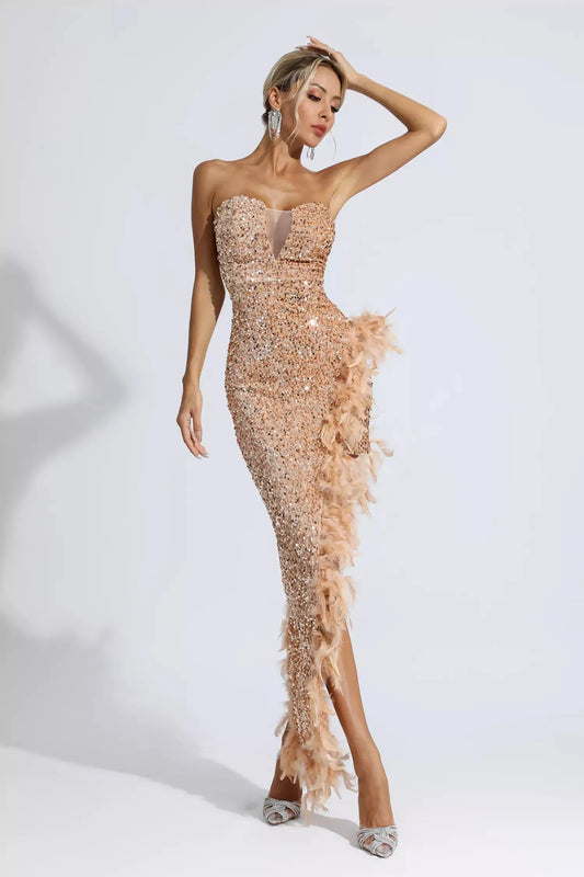 45% İndirimKira Şampanya Payetli Tüylü Uzun Elbise