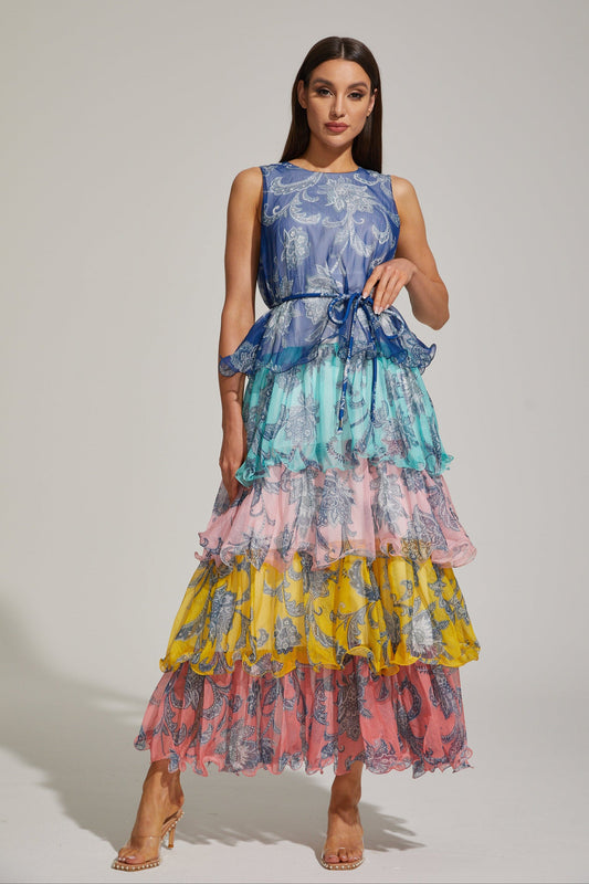 23% İndirimJanique Gökkuşağı Paisley Volanlı Uzun Elbise
