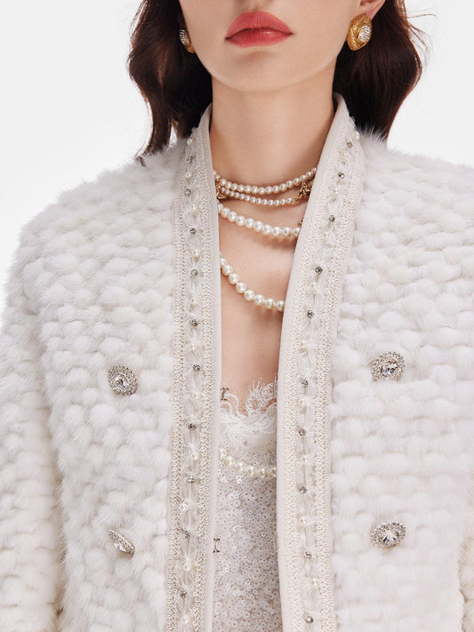 Beyaz Düğme Detaylı İncili Kısa Ceket