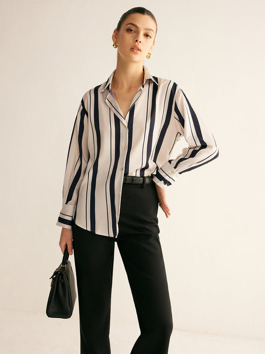 35% İndirimSaten Çizgili Düğmeli Rahat Gömlek