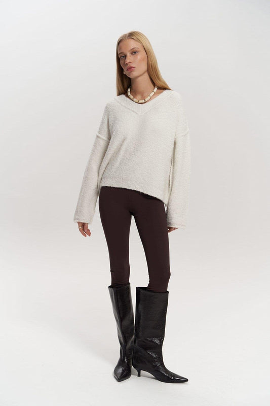 Peoria Boyunluk Detay V Yaka Ekru Triko Kazak