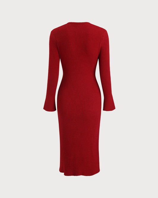 47% İndirimŞarap Kırmızısı V Yaka Düğmeli Kazak Elbise