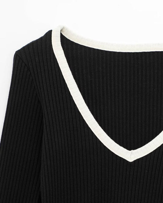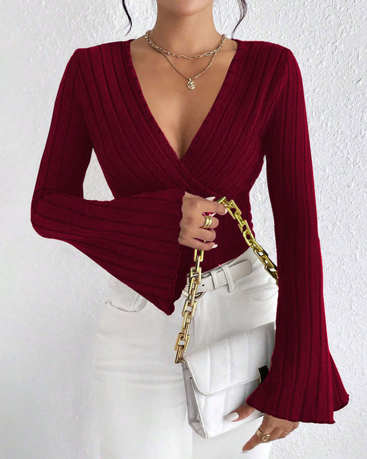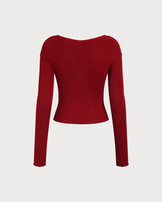 45% İndirimŞarap Kırmızısı V Yakalı Kaburga Örgü Tişört