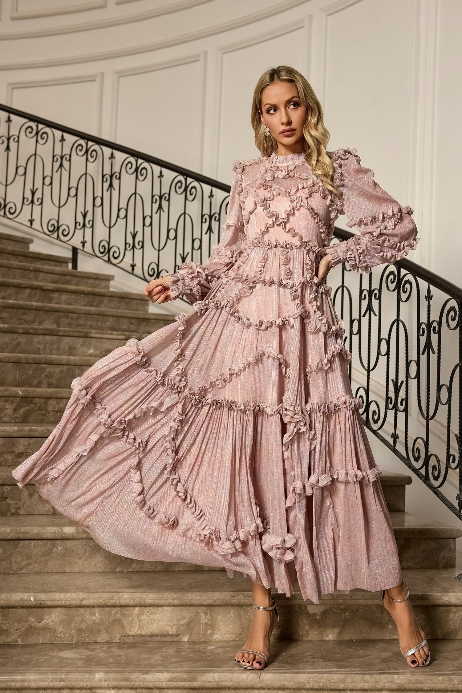 Macie Pembe Uzun Kollu Maksi Elbise