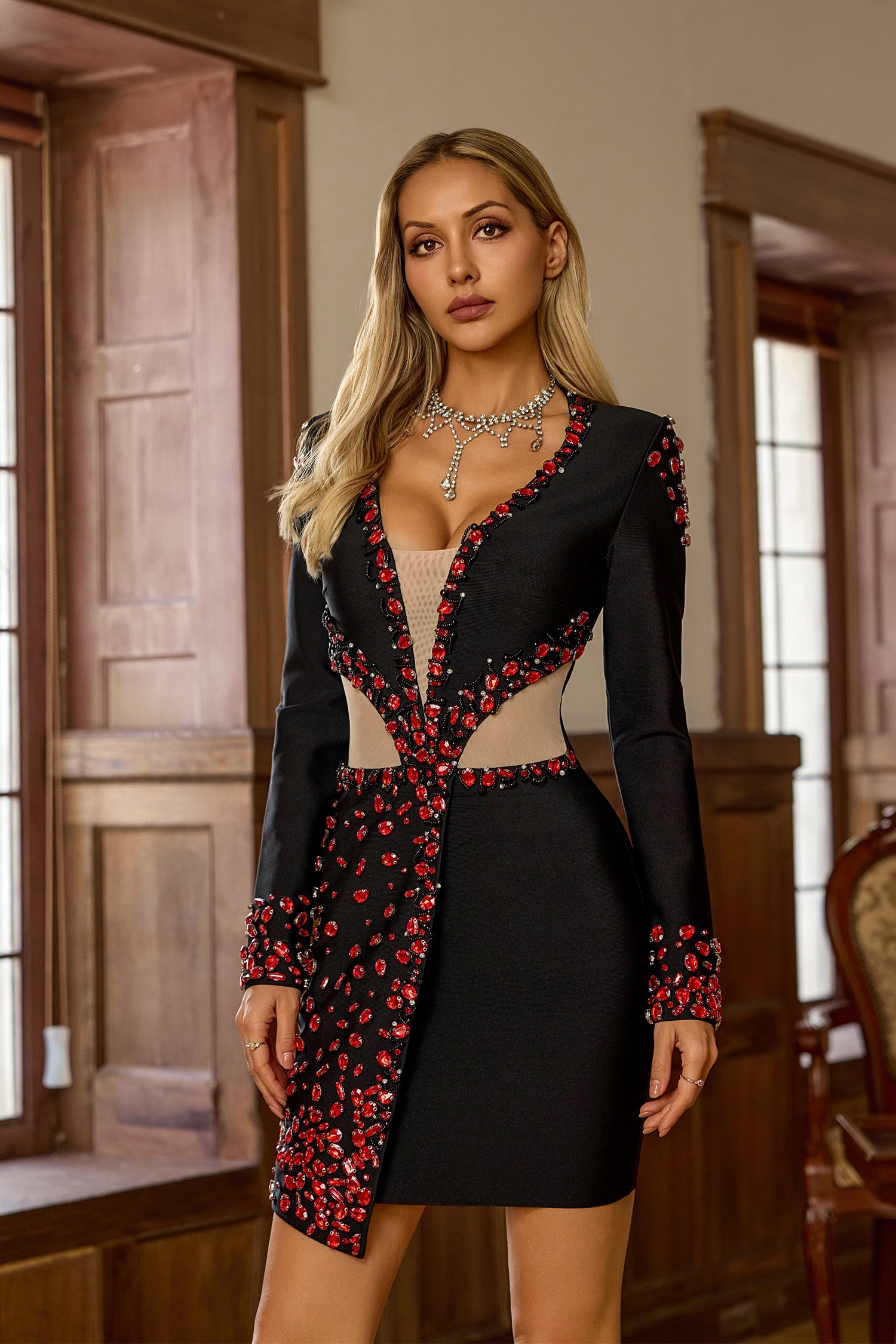 Kenzie Kırmızı Elmas Uzun Kollu Mini Elbise
