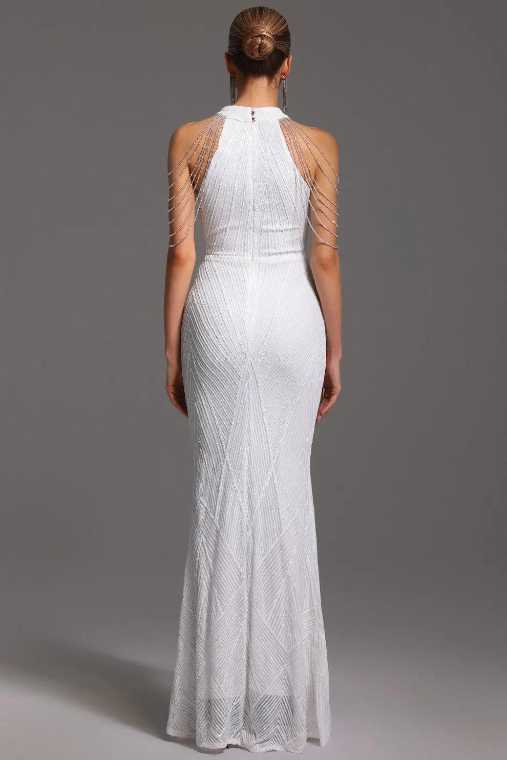 Elbisenin tamamını kaplayan, vücut hatlarını vurgulayan, sofistike ve geometrik Art Deko boncuk işlemeleri.
