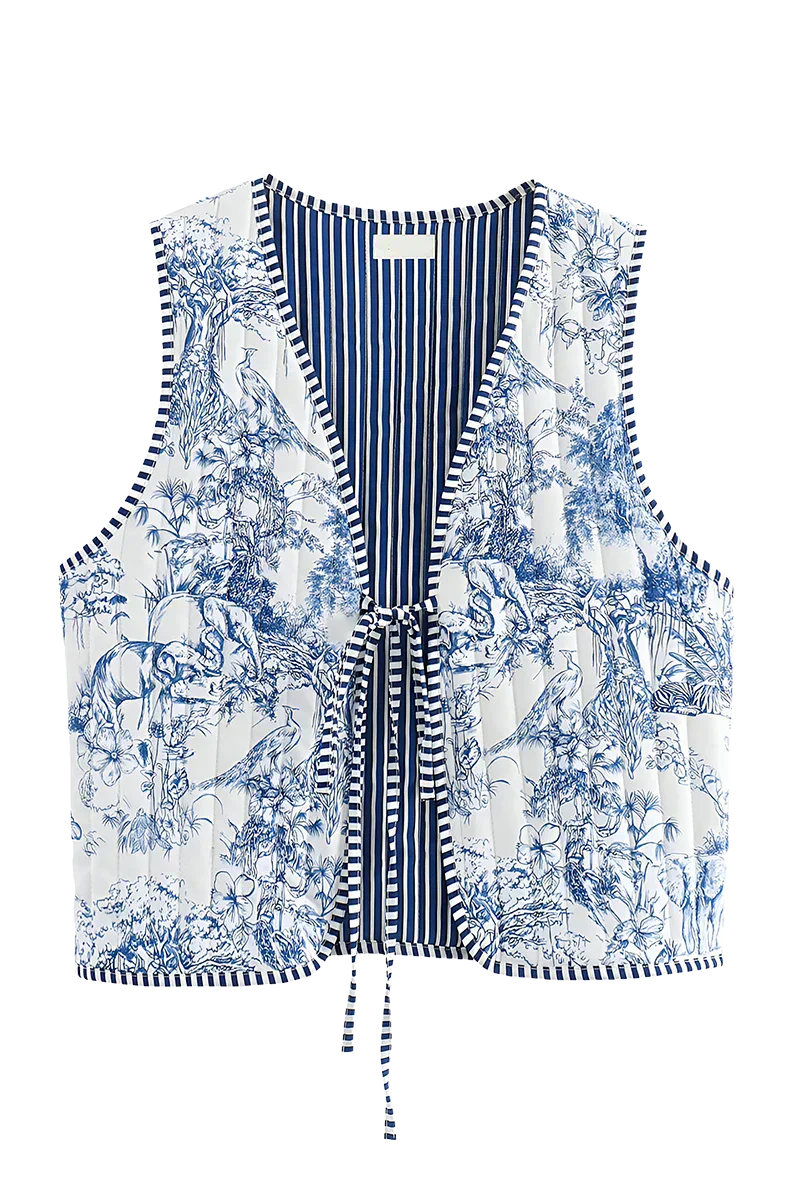 Vintage esintiler taşıyan bu desenli yelek, mavi-beyaz pastoral motifleri ve iç kısmındaki çizgili astarıyla çift yönlü bir şıklık sunuyor. Bağlamalı ön detayı sayesinde hem rahat hem feminen bir hava katar. Jean, basic bluz ya da elbiselerle kombinlenerek modern ve özgün bir stil yaratır.
