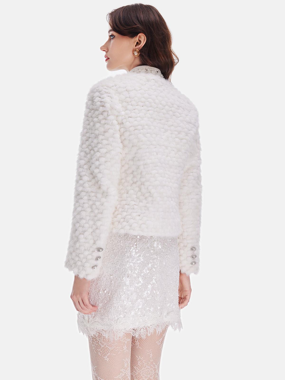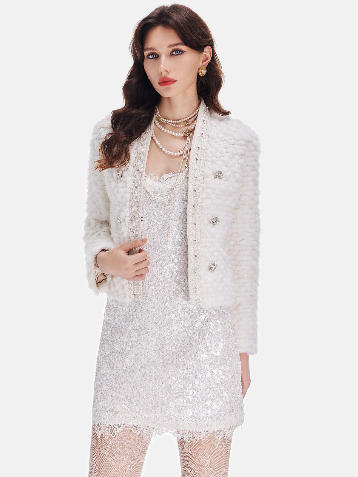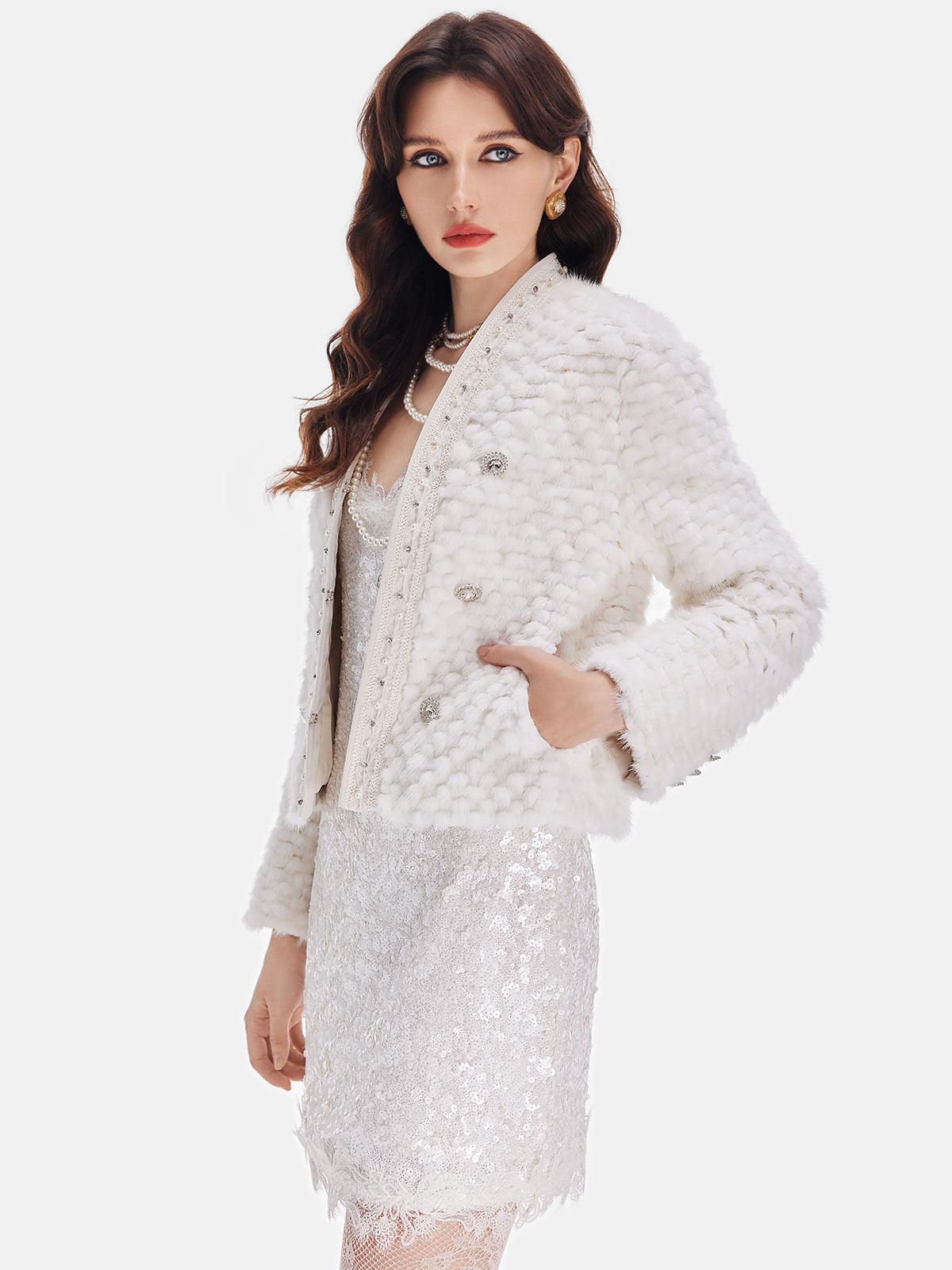 Lüks tasarımıyla öne çıkan bu beyaz kısa ceket, incili detayları ve düğme süslemeleriyle zarafeti yeniden tanımlıyor. Şıklığınızı tamamlamak için özel davetlerde veya günlük kombinlerinizde tercih edebilirsiniz. Hem sıcak tutan dokusuyla hem de göz alıcı görünümüyle stilinize değer katacak!