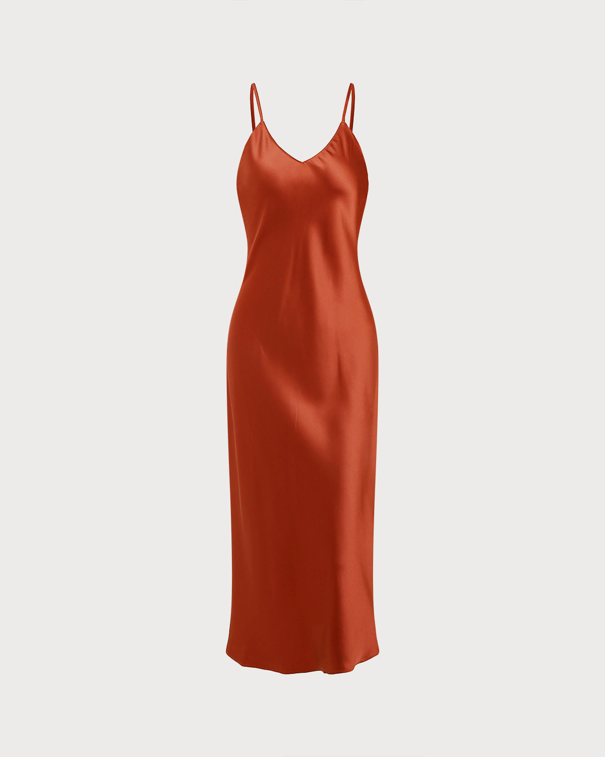 Tuğla Kırmızısı Saten Slip Uzun Elbise