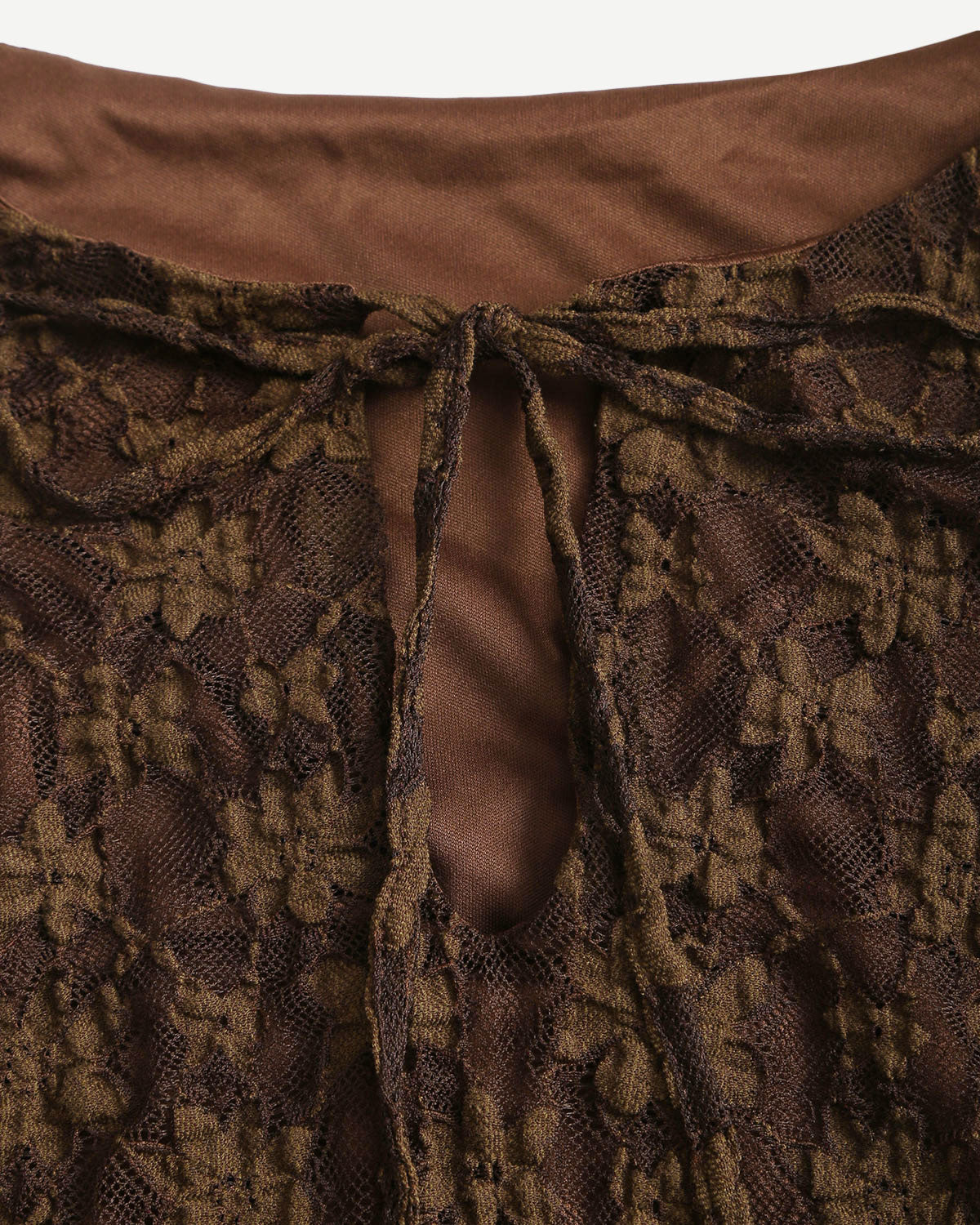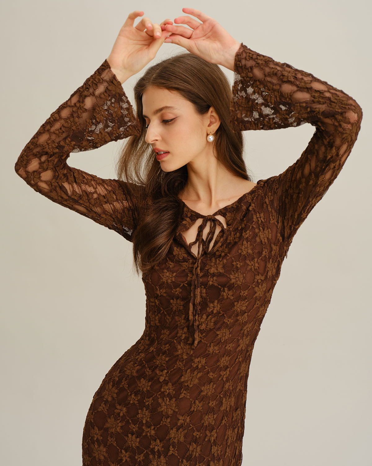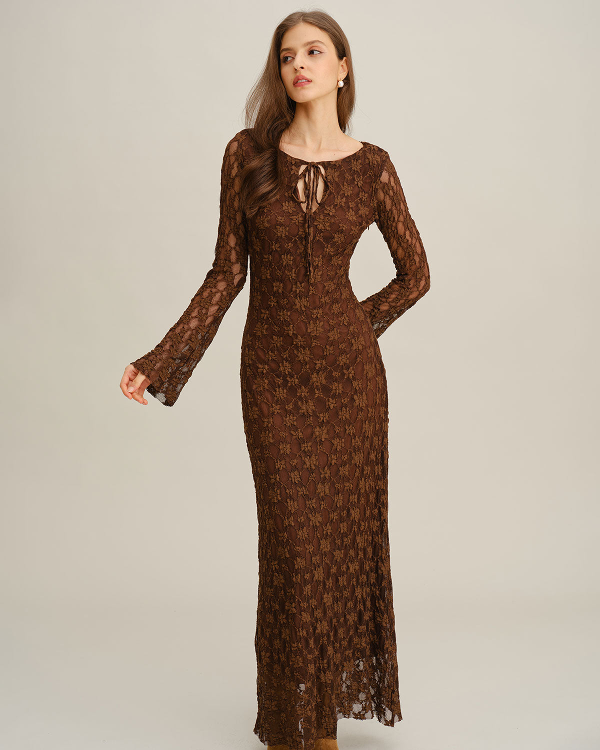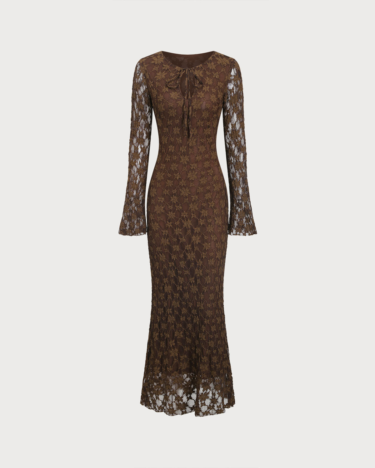 Kahverengi Çiçekli Çan Kollu Uzun Elbise