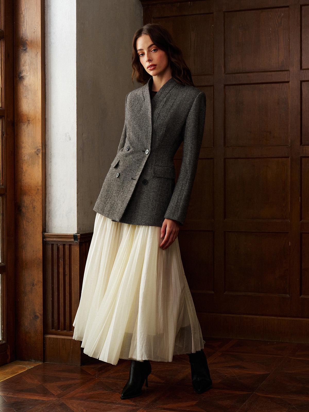 Şıklığın klasik bir temsilcisi olan bu gri kazayağı desenli blazer ceket, çift düğmeli tasarımı ve zarif kesimiyle dikkat çekiyor. Hem iş stilinizde hem de özel günlerde tercih edebileceğiniz zamansız bir parça!