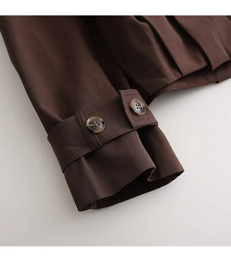 Modern ve şık bir tarz için tasarlanan kısa kadın trench coat, rahat kesimi ve kontrast kumaş detaylarıyla her kombine sofistike bir hava katar. Geçiş mevsimlerinde hem şıklığı hem de konforu bir arada sunar.
