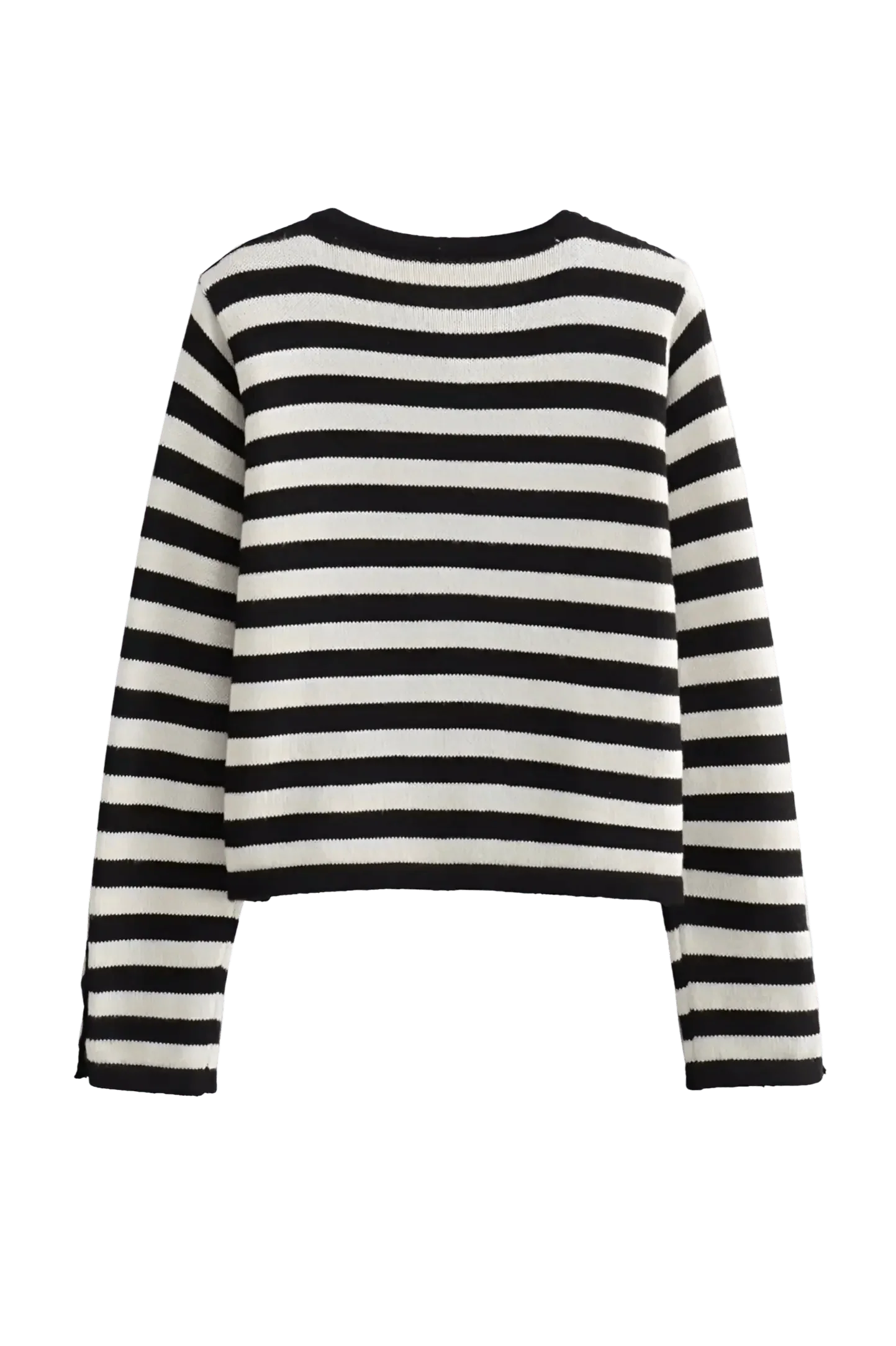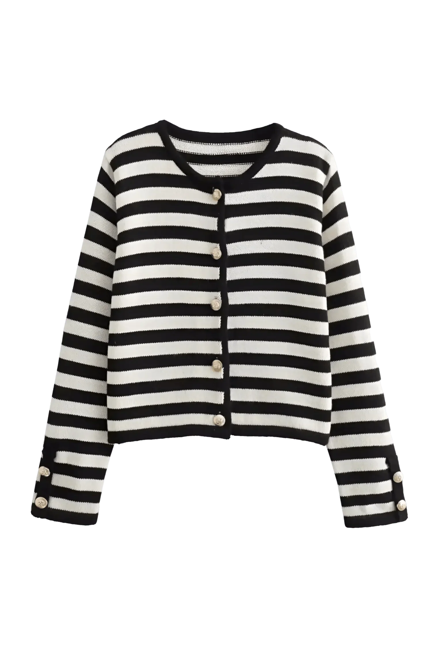 Sonbaharın yeni ürünümüzle tanışın: Chanel'den ilham alan klasik görünümü bünyesinde barındıran bedene oturan, şık çizgili örgü hırka. Bu yakasız kısa kazak, kıyafetinize sofistike bir dokunuş katan zarif dekoratif düğmelere sahiptir.