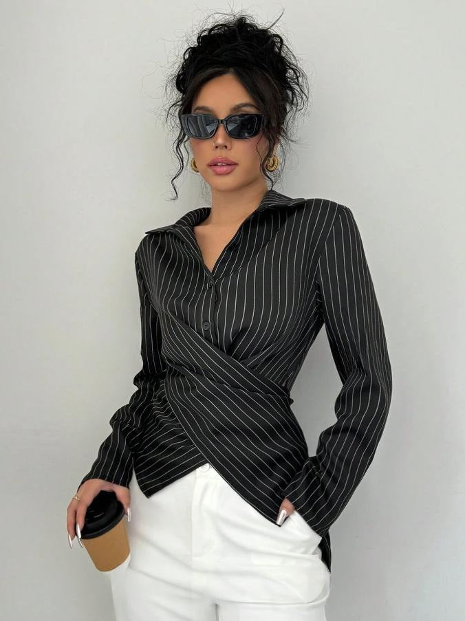 Ofis şıklığını modern bir dokunuşla yeniden yorumlayan bu siyah çizgili gömlek, kruvaze kesimiyle klasik görünümü sofistike hale getiriyor. Vücuda oturan formu ve zarif çizgileriyle hem iş kombinlerinde hem de şehir stilinde güçlü bir alternatif sunar.