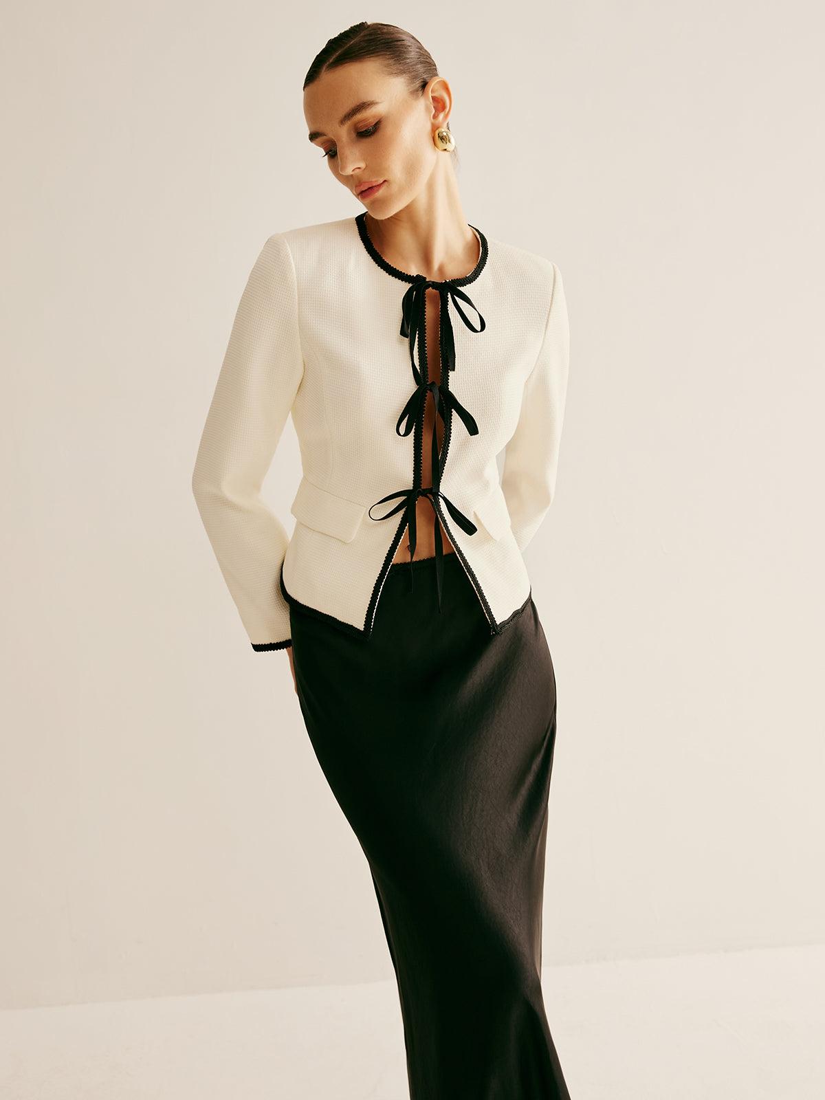Ekru Siyah Kurdele Detaylı Blazer Ceket