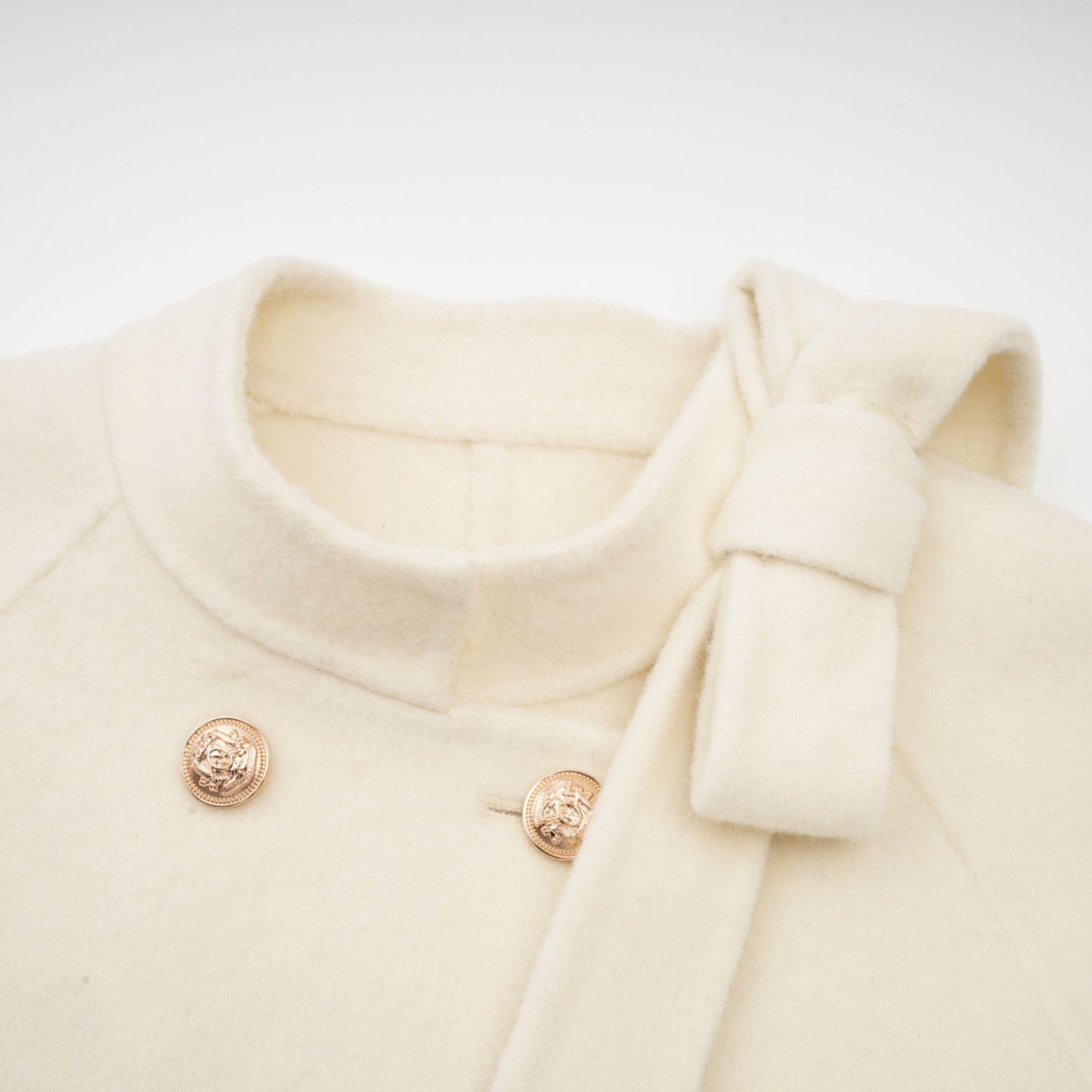 "Elegant Charm" kaban, şıklık ve zarafeti bir araya getiriyor. Yumuşak dokulu krem rengi kumaşı, altın detaylı düğmeleri ve kürk manşetleriyle kış sezonunda tarzınızı bir üst seviyeye taşıyın. Özel davetlerden günlük kullanıma kadar her ortam için mükemmel bir seçim!
