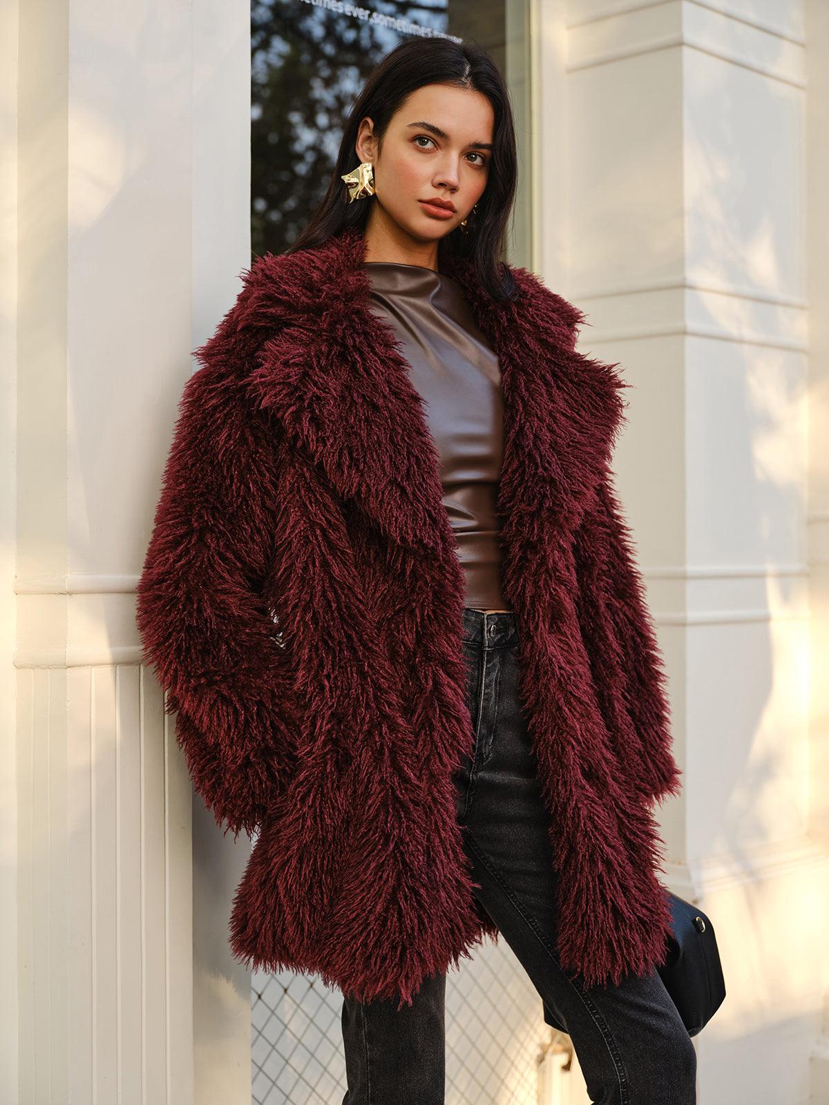 Yumuşak dokusu ve bordo rengiyle lüks bir görünüm sunan bu tüylü kürk ceket, kış stilinizi yükseltecek bir parça. Hem casual hem de özel kombinler için göz alıcı bir seçim!