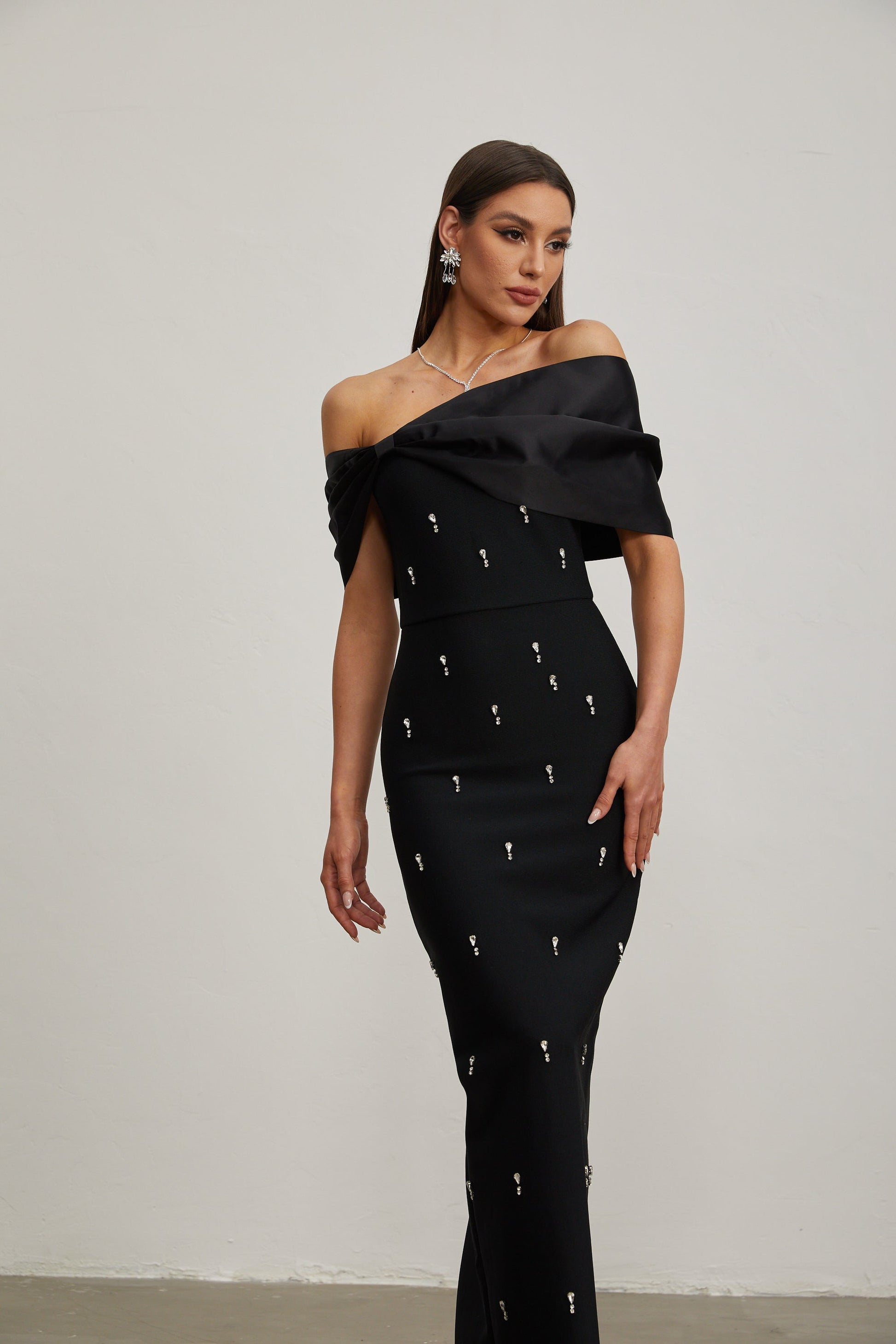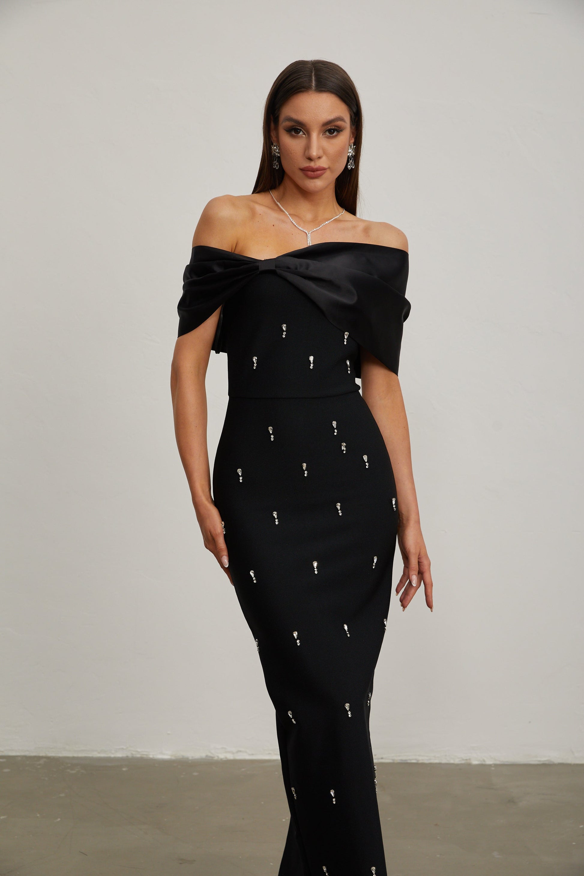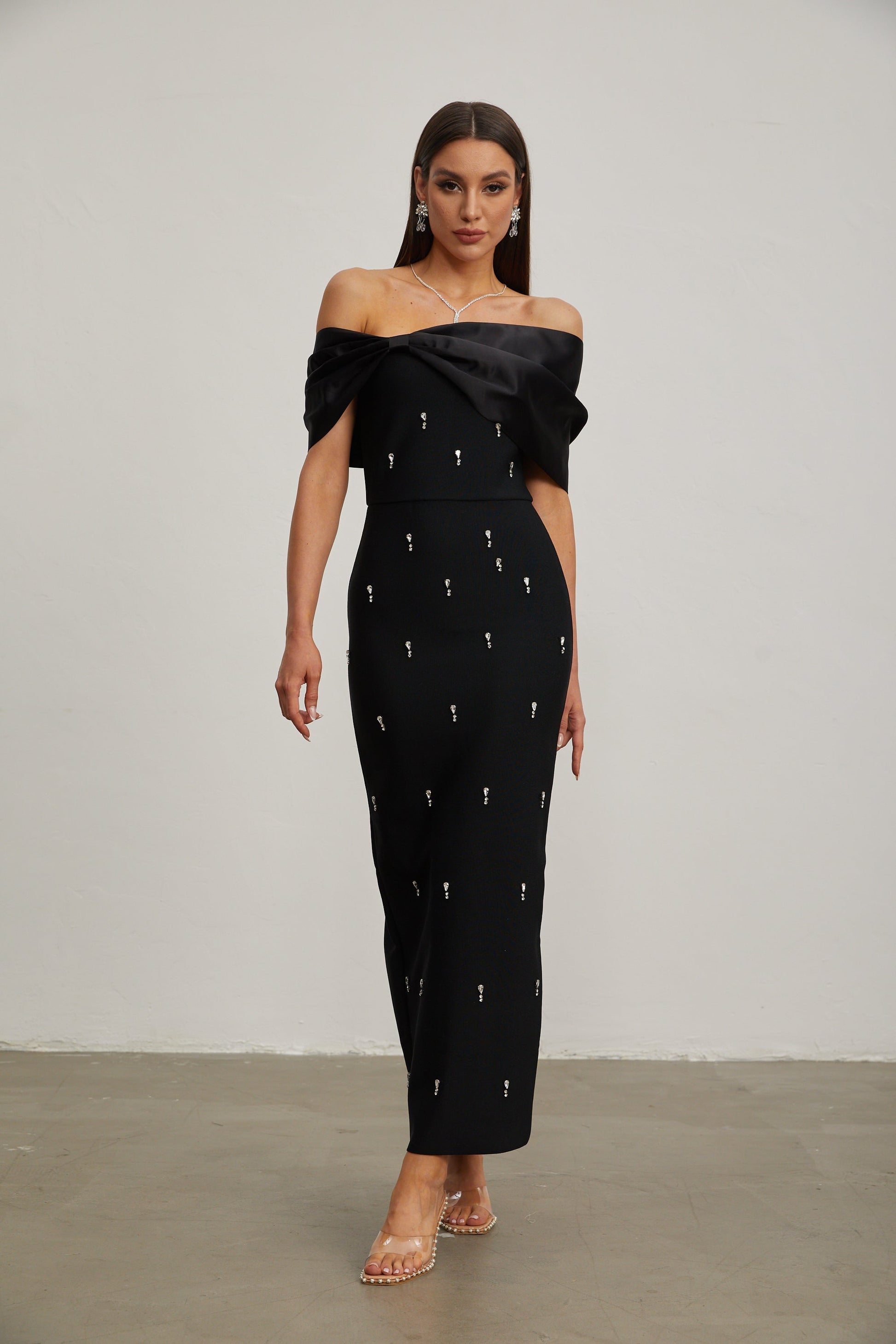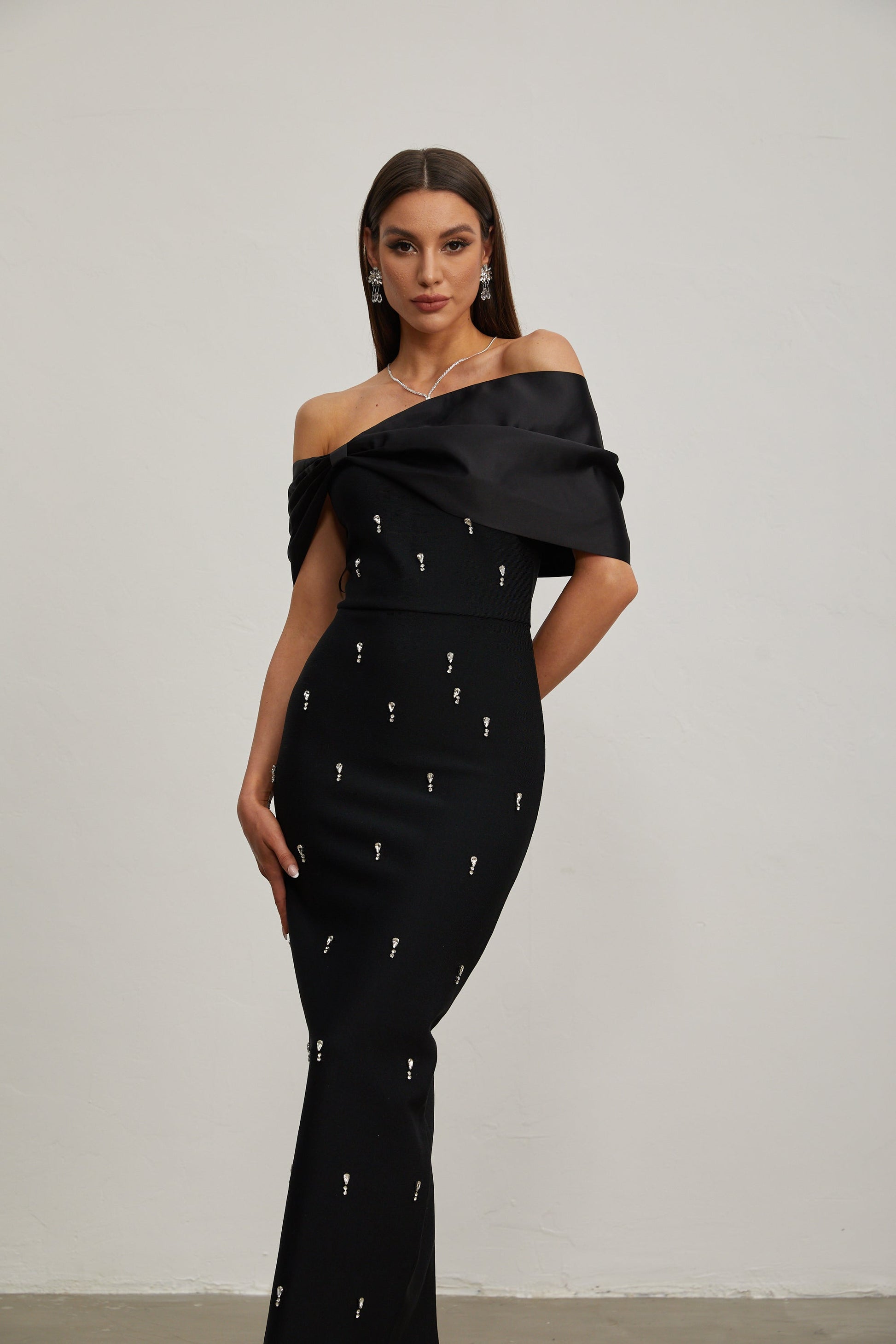 Elspeth Noir Süslemeli Omuz Açık Uzun Elbise