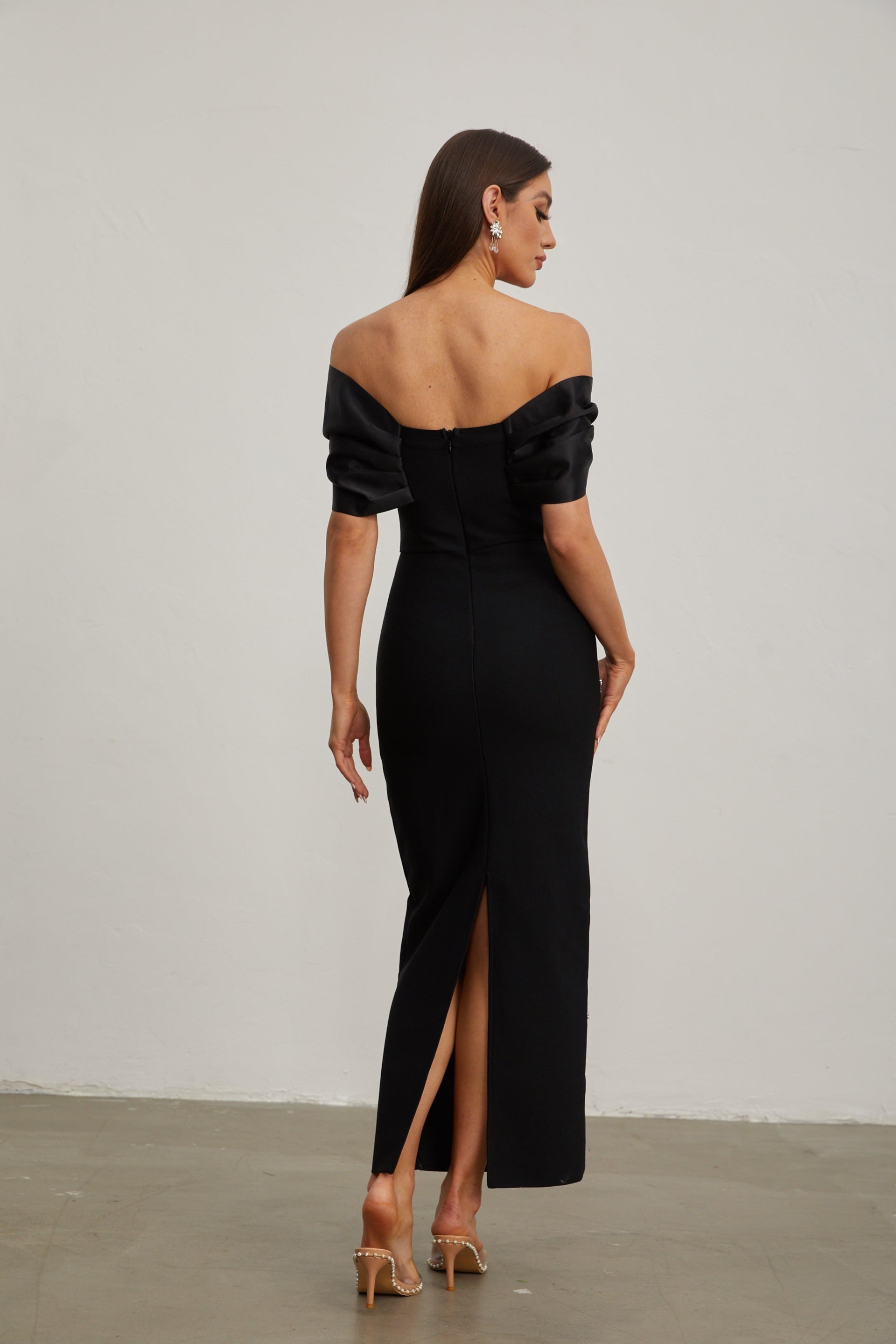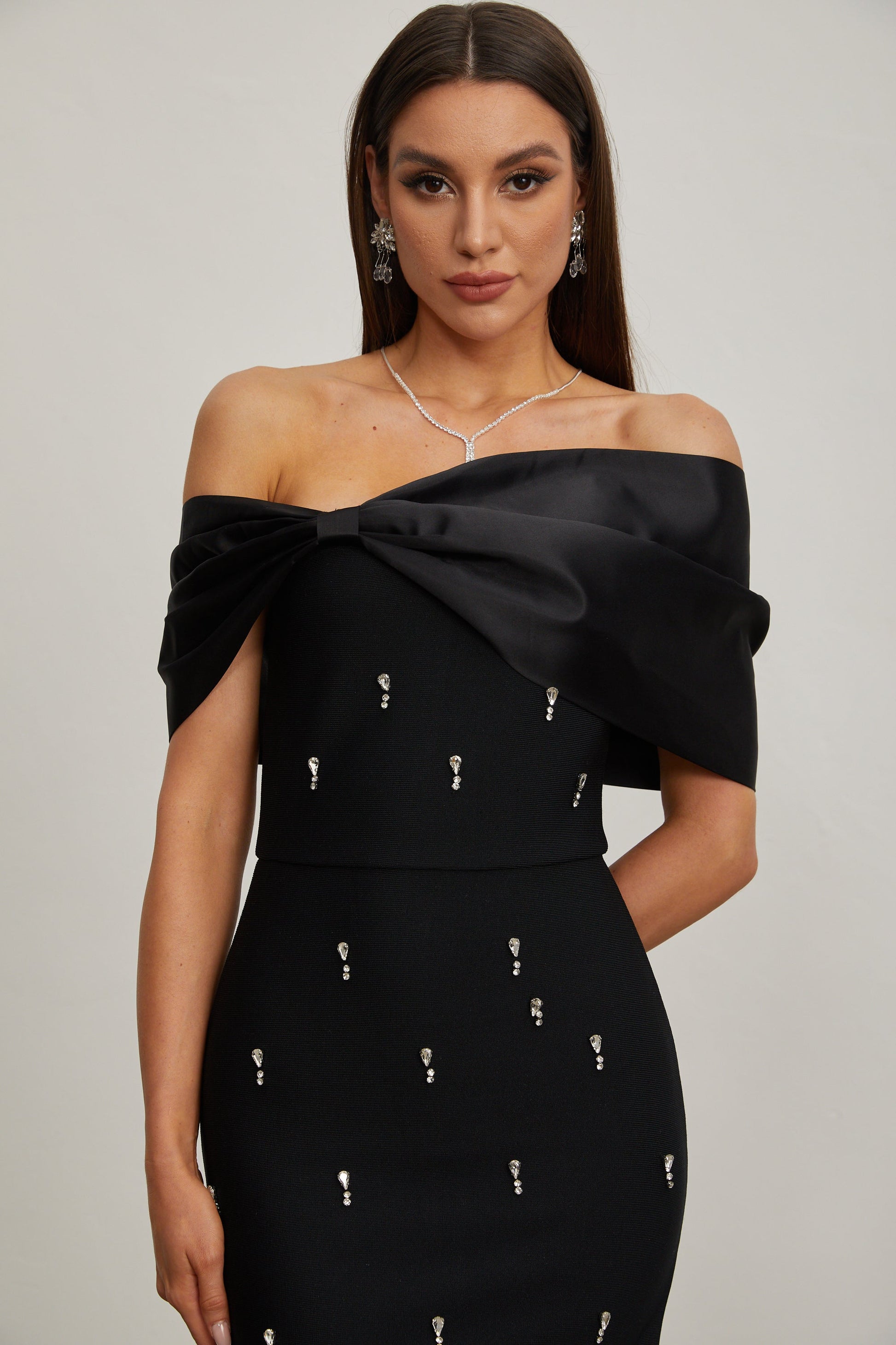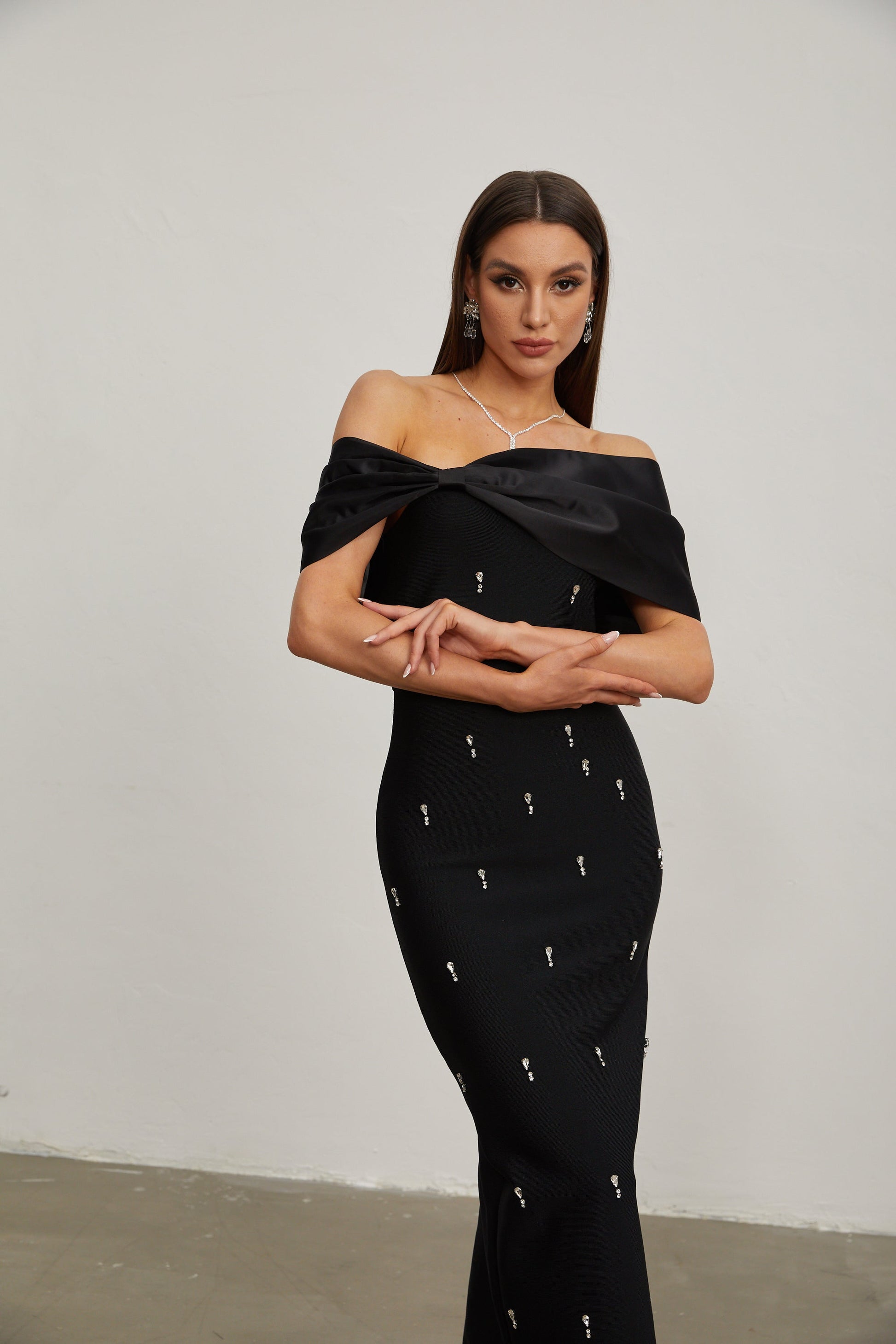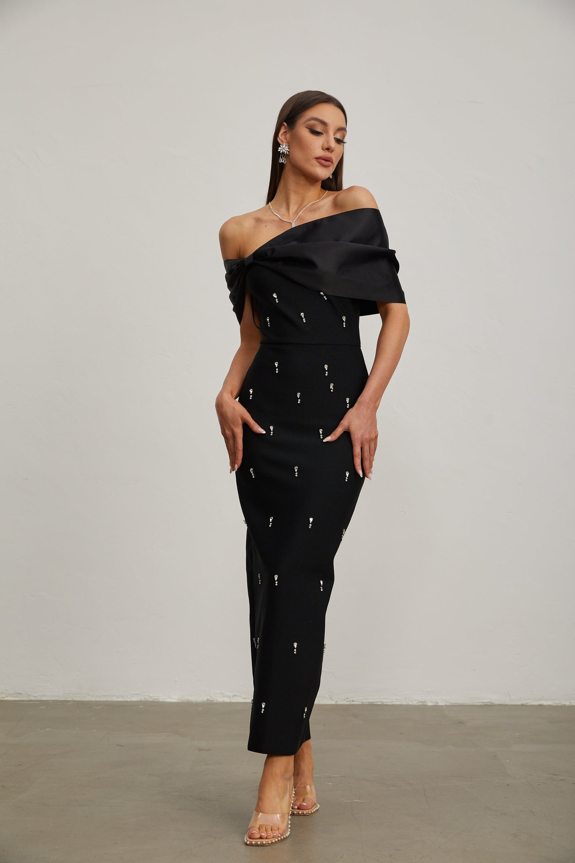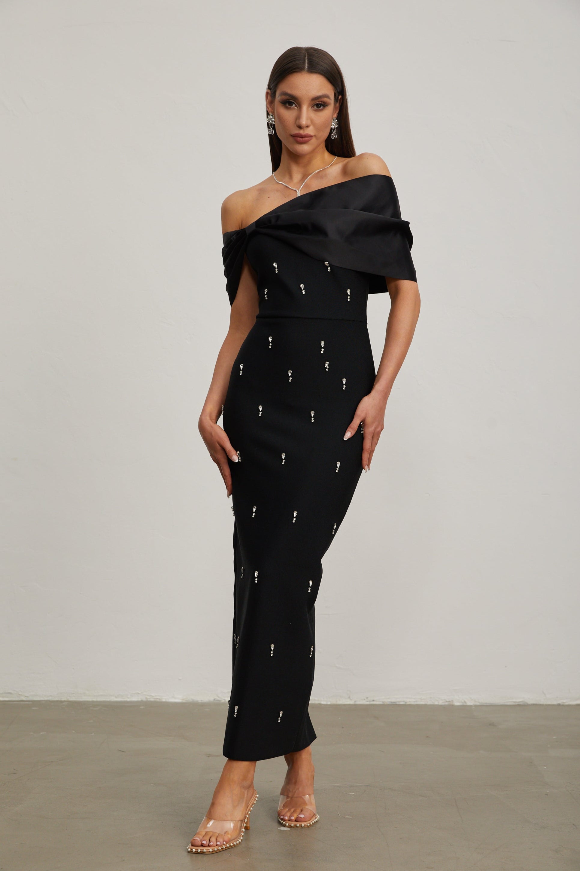 Elspeth Noir Süslemeli Omuz Açık Uzun Elbise