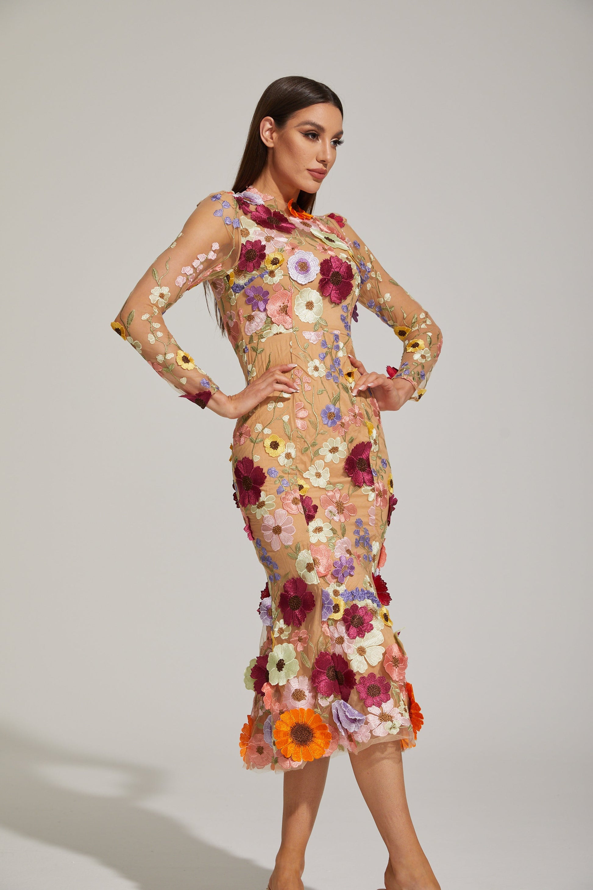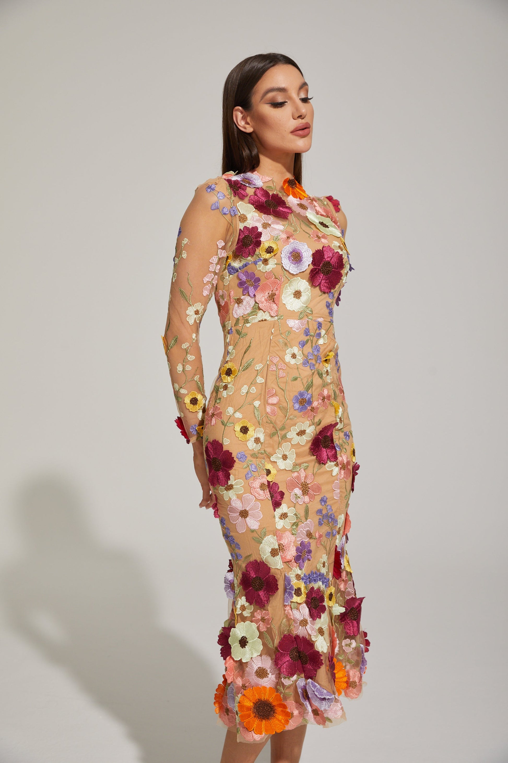 Yüksek Yakalı ve Midi Etekli Çiçek Desenli Dantel Elbise
