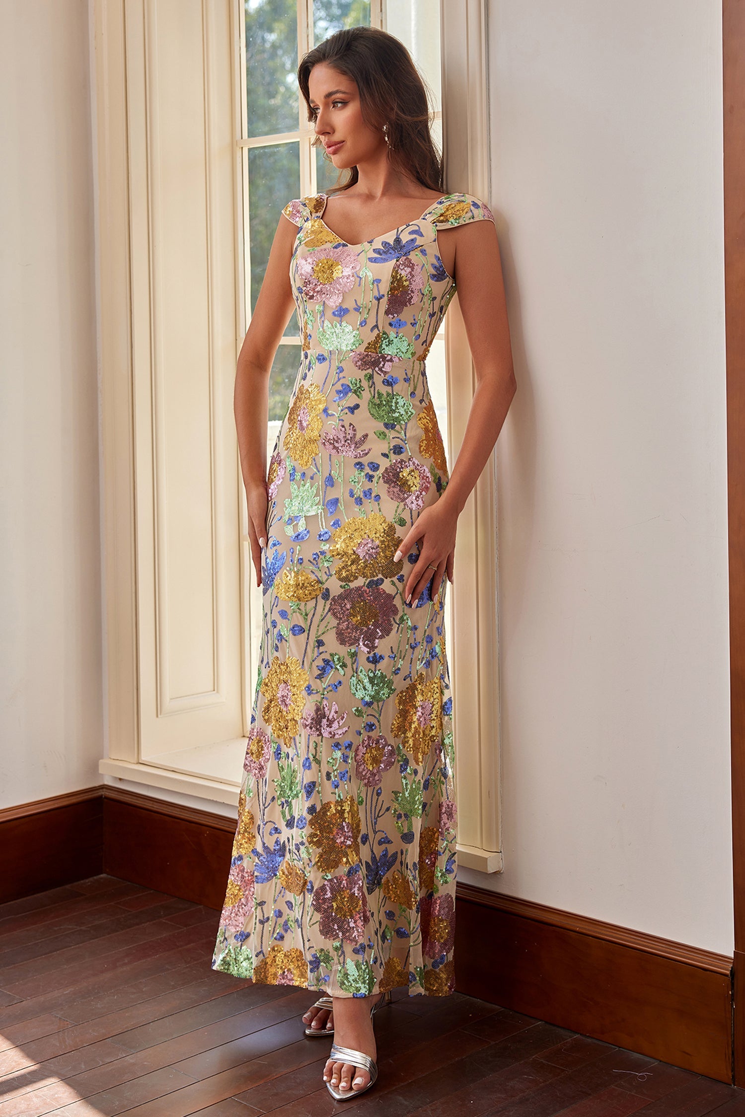 Fiorella Payetli Çiçek Desenli Uzun Elbise