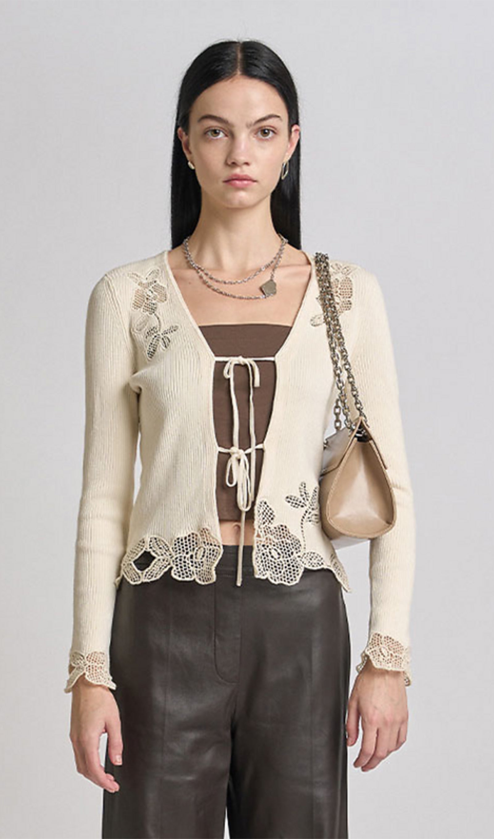 Dantel detayları ve bağcık kapamasıyla feminen dokunuşu vurgulayan modern hırka modeli.