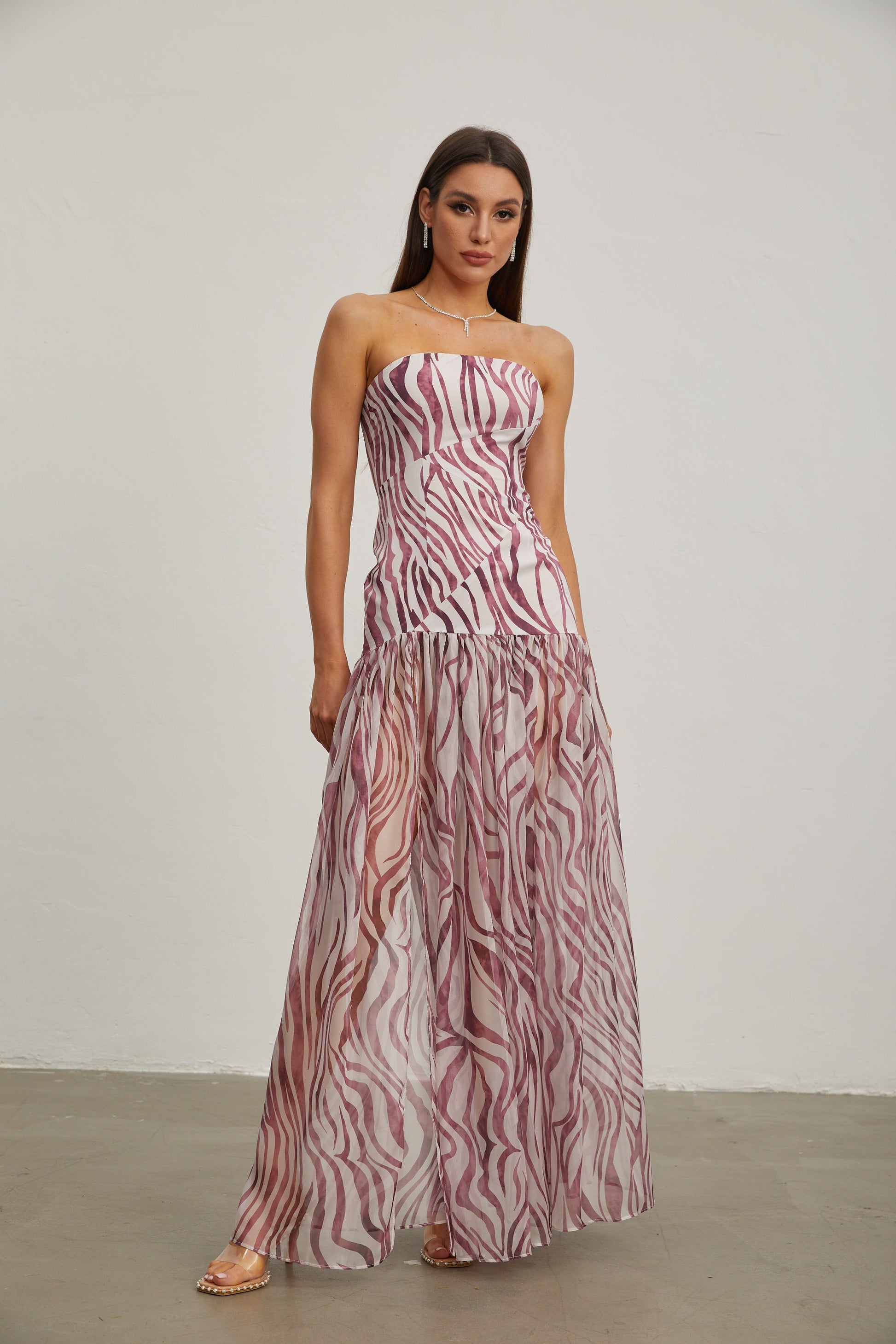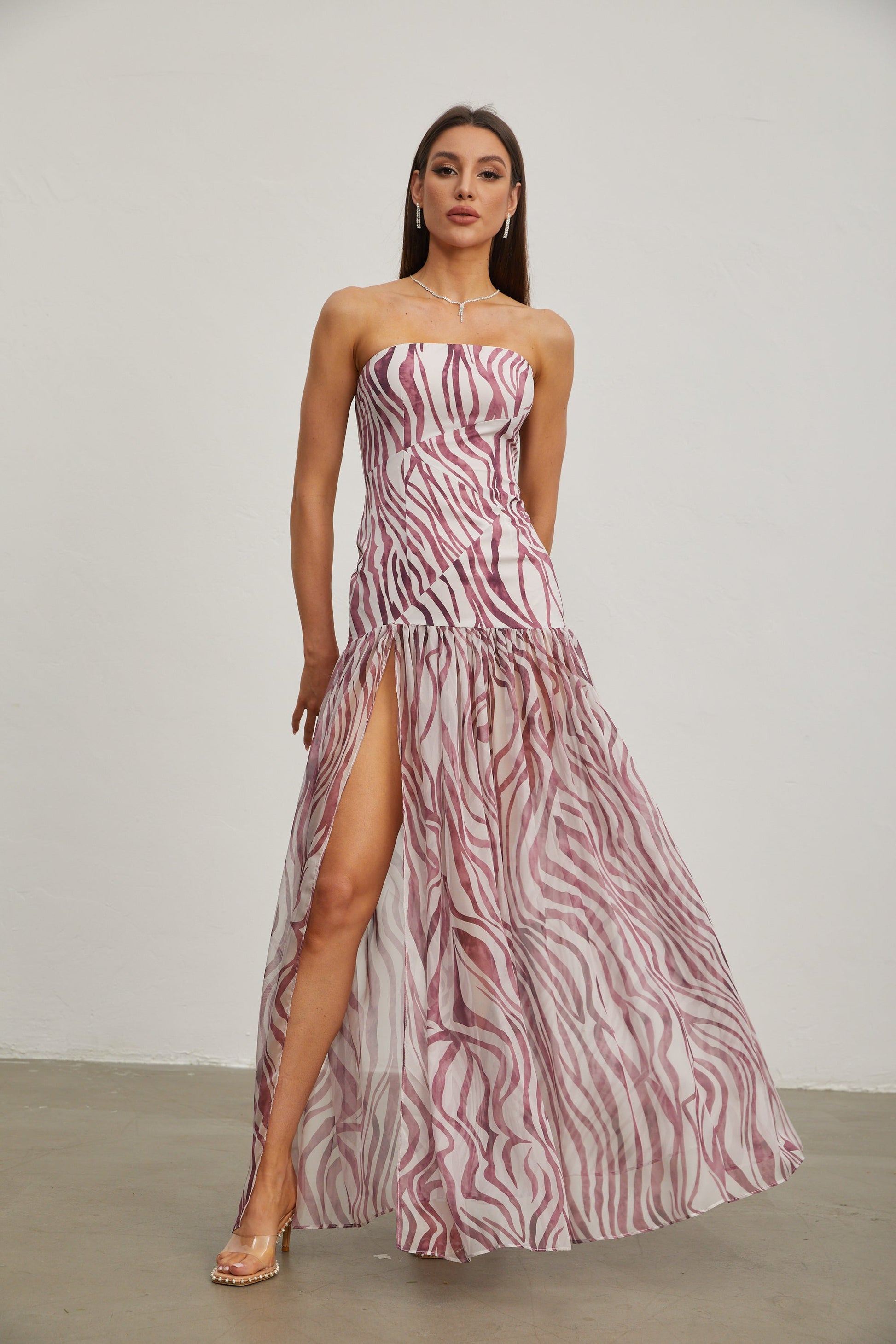 Giselle Rose Zebra Desenli Straplez Uzun Elbise