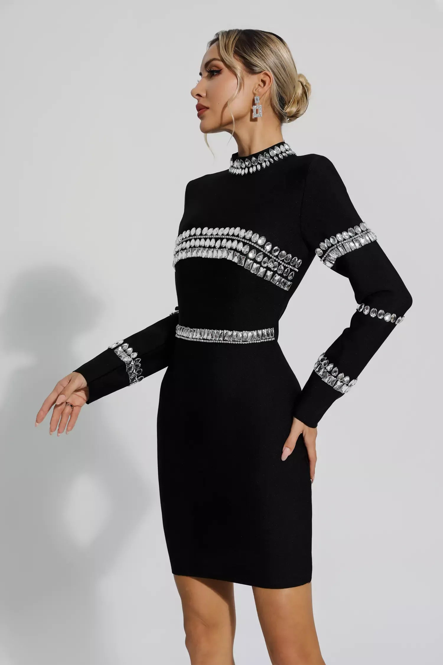 Hayley Siyah Elmas Süslemeli Uzun Kollu Mini Elbise