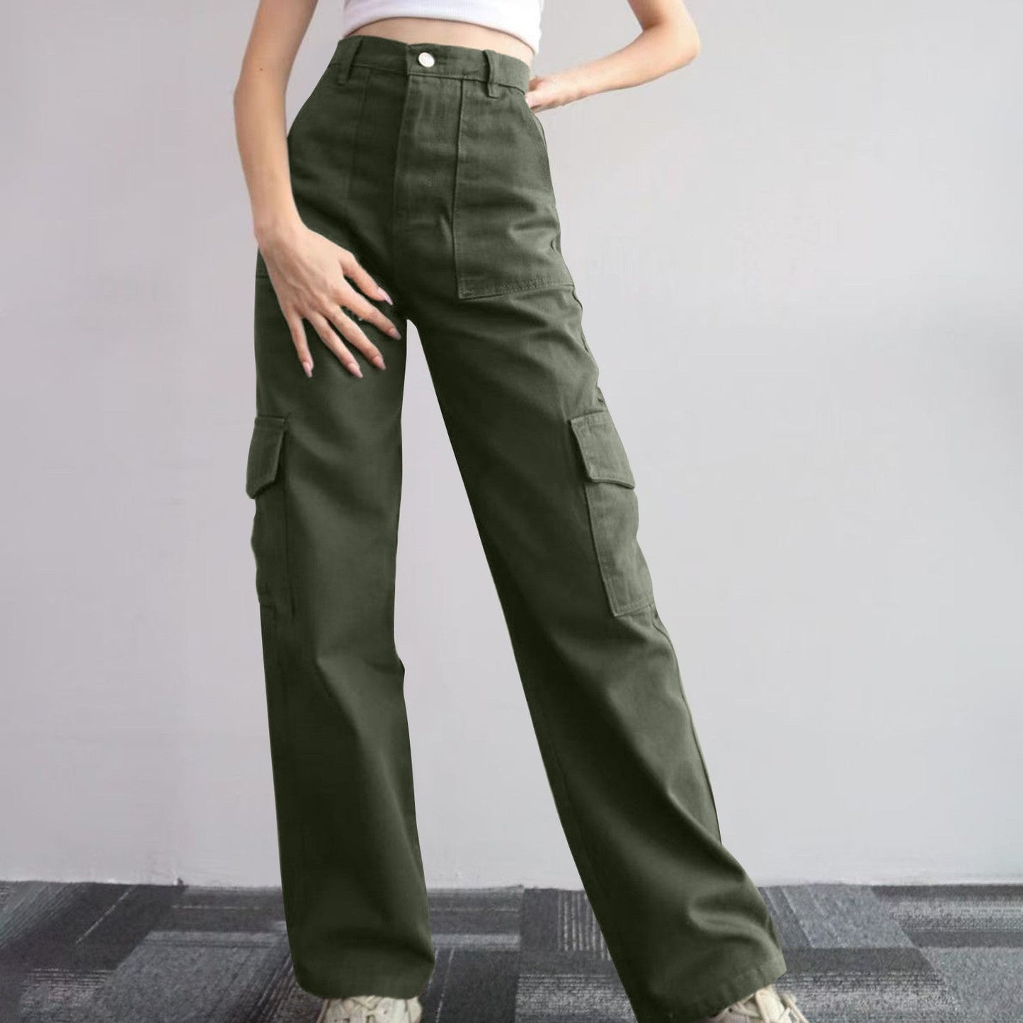 Yüksek bel, yan cepli siyah kargo pantolon.
