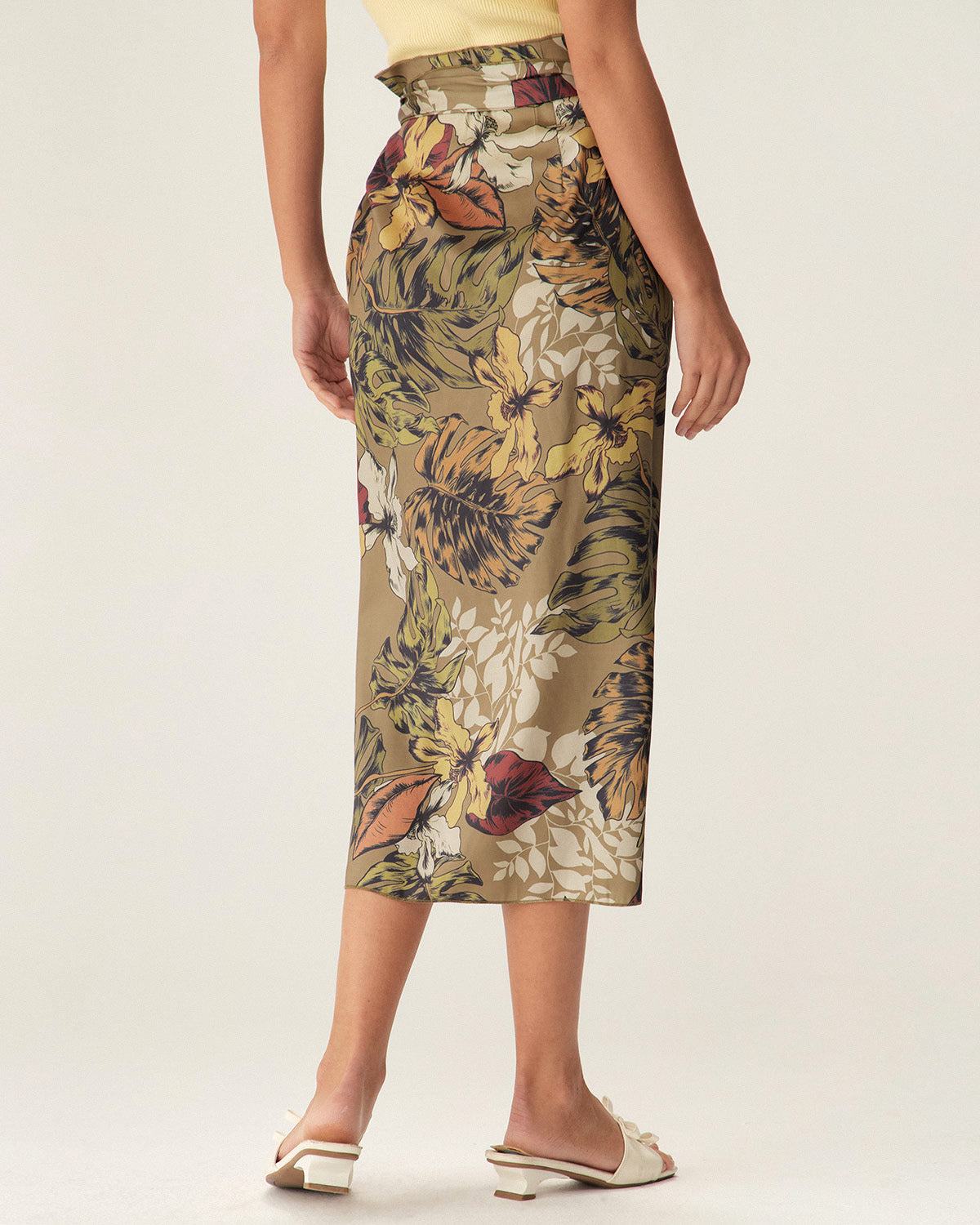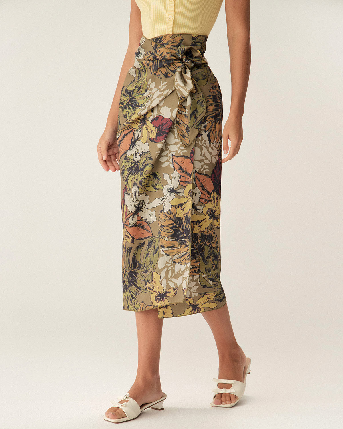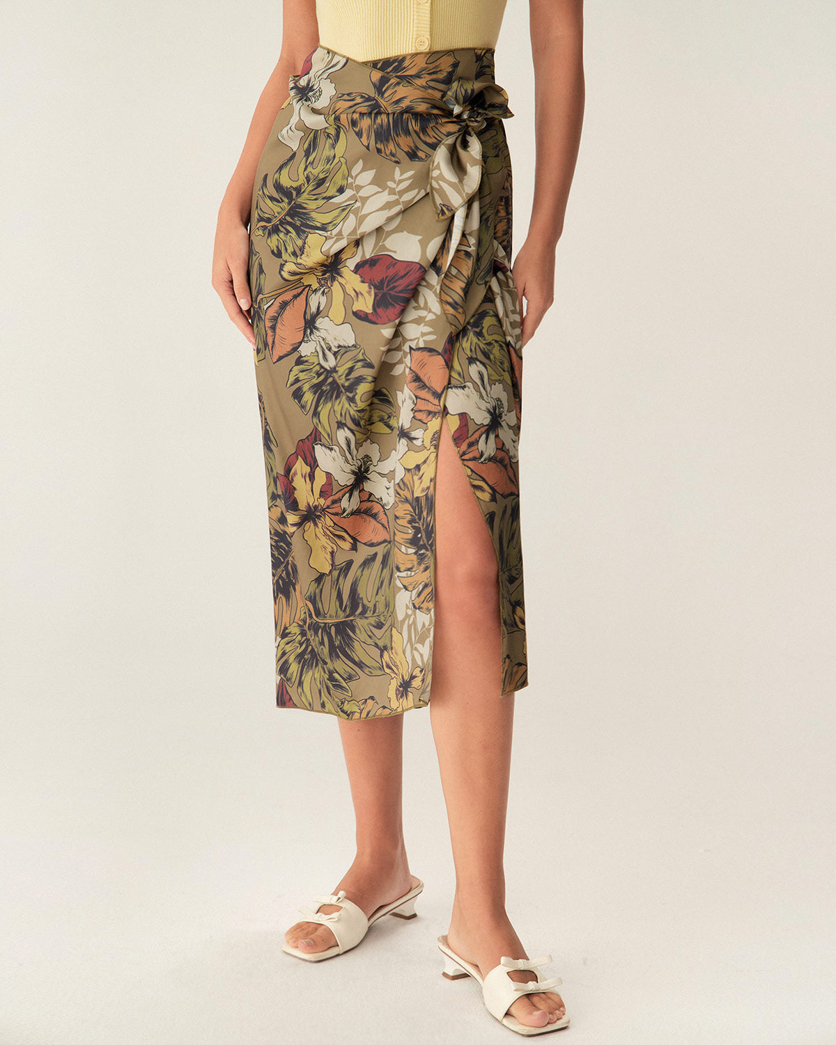 Haki Çiçekli Yüksek Bel Sarma Midi Etek