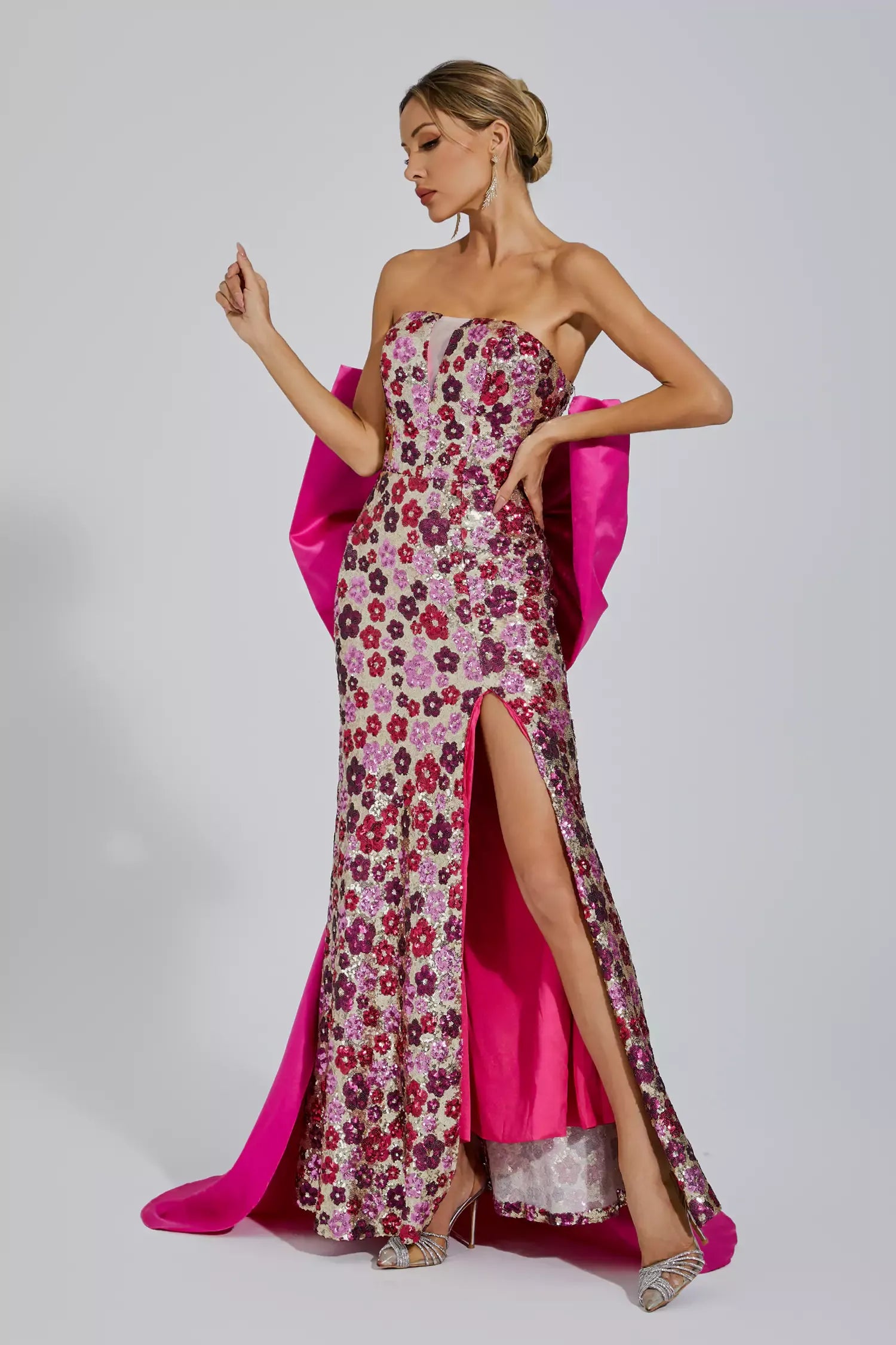 Kiera Pembe Çiçek Payetli Uzun Elbise