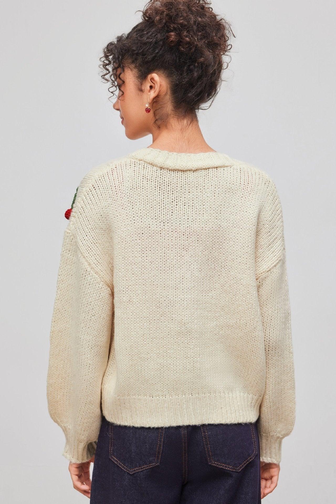 Bu tatlı V yakalı hırka, eğlenceli bir dokunuş katan büyüleyici kiraz süslemesiyle sonbahar ve kış için mükemmeldir. Rahat kesimi ve tek sıra düğmeli kapamasıyla tasarlanan bu parça, sevimli ve rahat bir görünüm için her türlü kıyafetin üzerine kolayca giyilebilen çok yönlü bir parçadır.