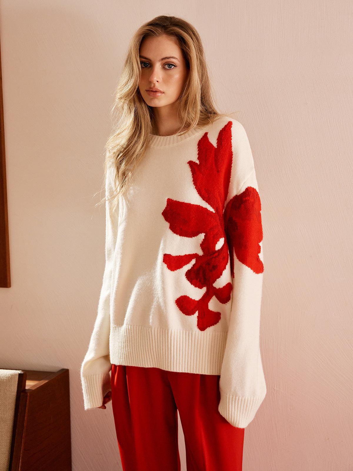 Kırmızı Çiçek Desenli Oversize Triko Kazak
