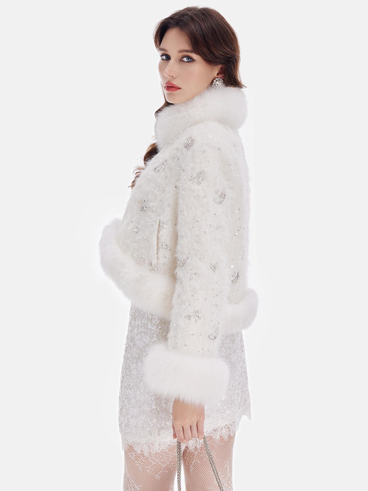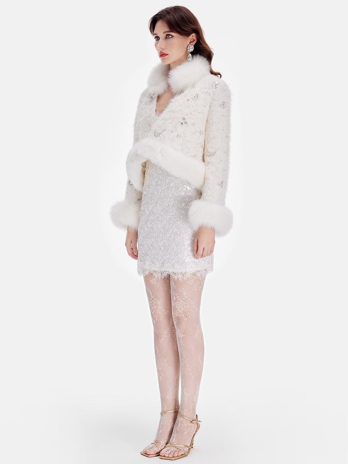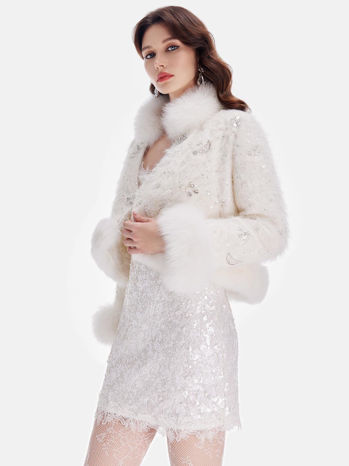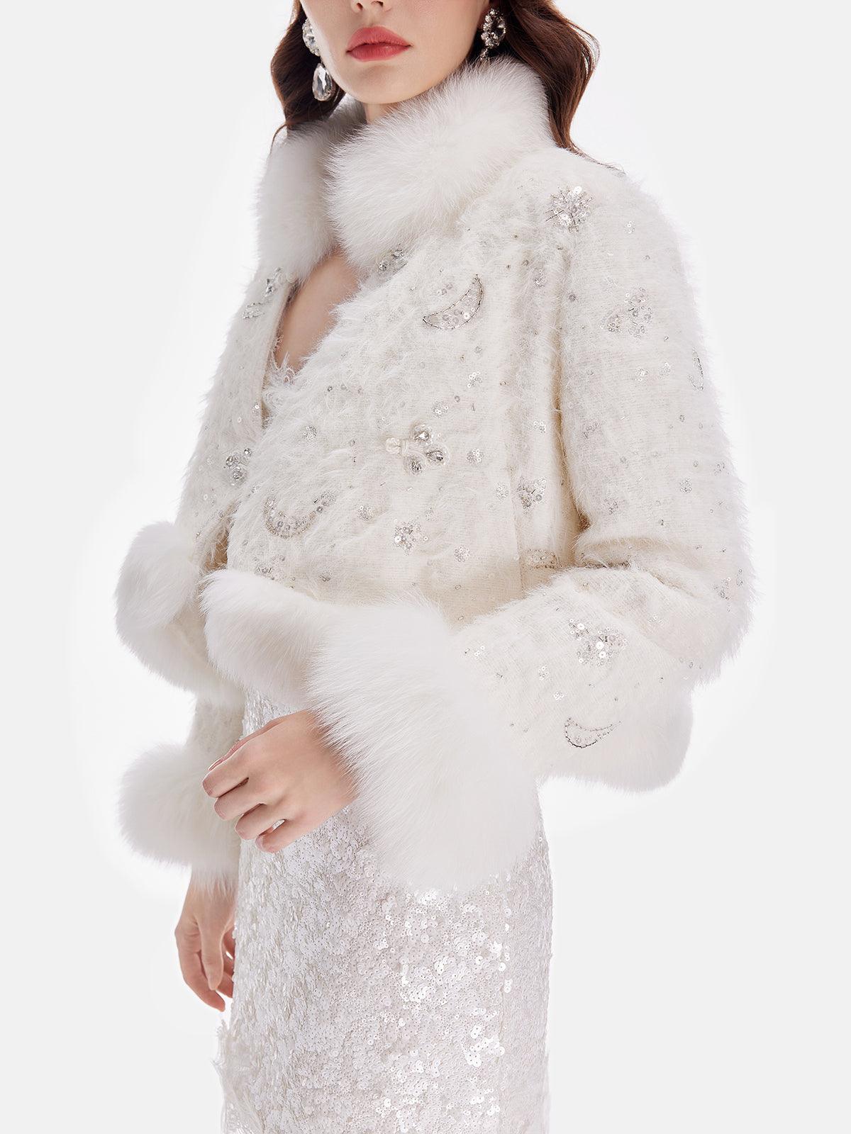Detaylardaki zarafet ve kürkün sıcak dokusu, Kristal İşlemeli Beyaz Kürk Ceket'te buluşuyor. Özel işlemeleri ve kürk detayları ile kış davetlerinde göz alıcı bir stil yaratabilirsiniz. Şıklığı ve konforu bir arada sunan bu tasarım, gardırobunuzun vazgeçilmezi olacak!