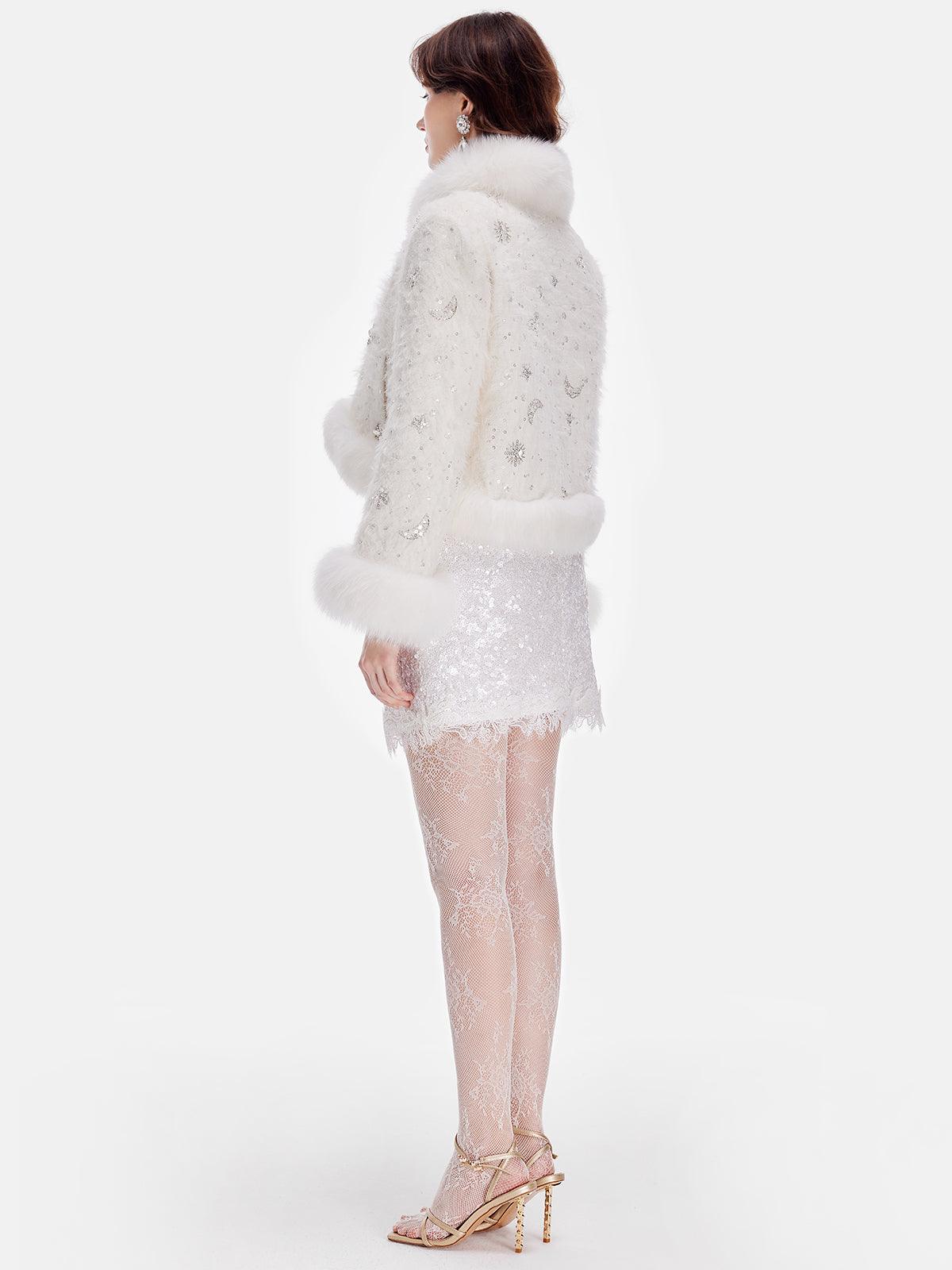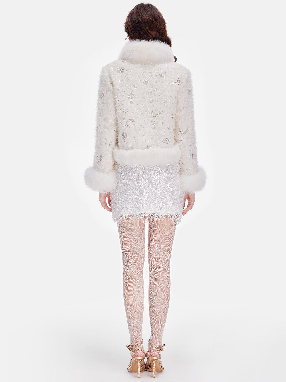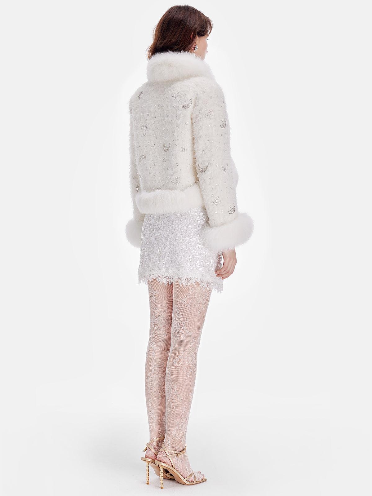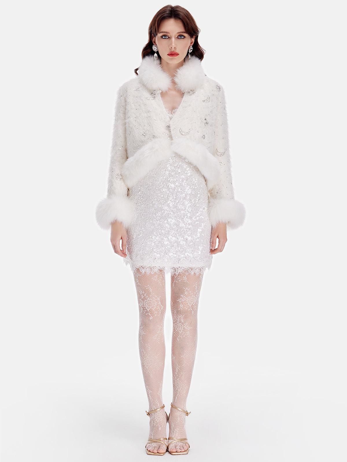 Detaylardaki zarafet ve kürkün sıcak dokusu, Kristal İşlemeli Beyaz Kürk Ceket'te buluşuyor. Özel işlemeleri ve kürk detayları ile kış davetlerinde göz alıcı bir stil yaratabilirsiniz. Şıklığı ve konforu bir arada sunan bu tasarım, gardırobunuzun vazgeçilmezi olacak!