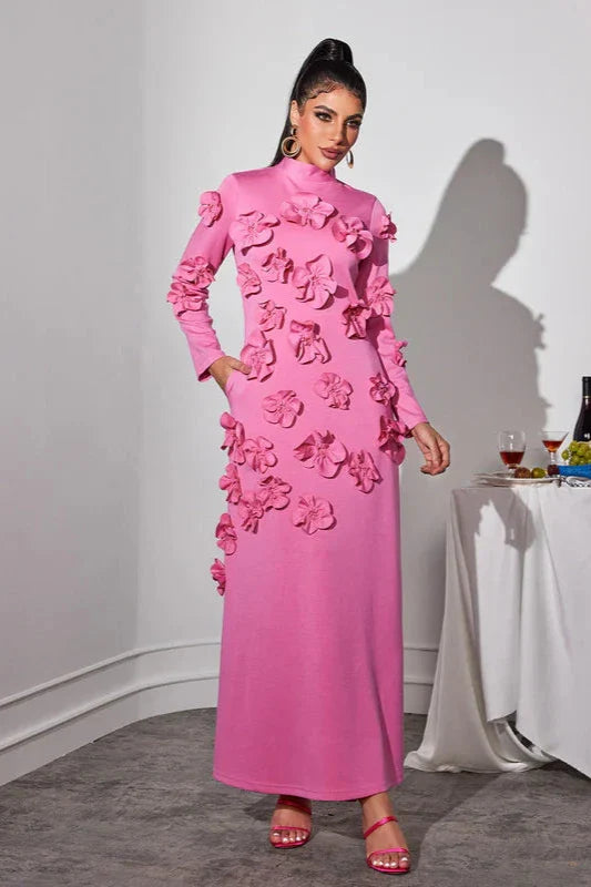 Elva Pembe Uzun Kollu Çiçekli Uzun Elbise
