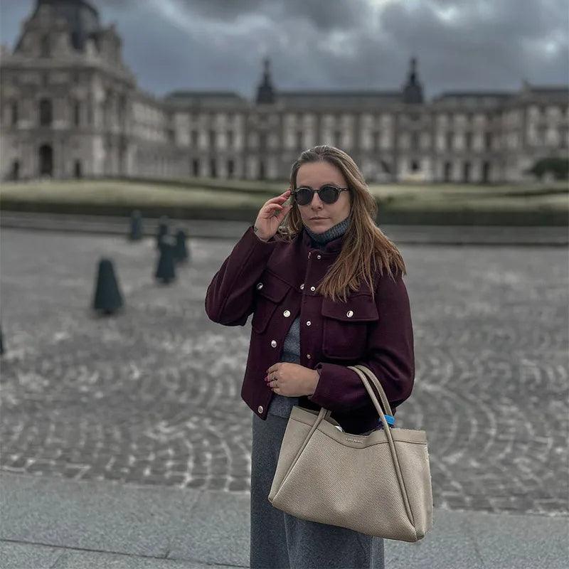 Bu özel dikim bordo ceket, hem dayanıklılık hem de rahatlık sunan yüksek kaliteli, orta ağırlıkta bir kumaştan üretilmiştir. Yapılandırılmış tasarım, keskin hatlar ve güçlendirilmiş dikişlerle zenginleştirilmiş düz bir kesime sahiptir. Altın tonlu metalik düğmeler, koyu bordo rengine çarpıcı bir kontrast sağlayarak sofistike bir dokunuş katar. Fonksiyonel unsurlar arasında pratiklik için iki adet kapaklı ön yama cebi ve gösterişli bir görünüm için düğmeli kapama bulunur. Geçiş mevsimleri için ideal olan bu ceket, çok yönlü bir gardırop elyafı için klasik estetiği modern detaylarla birleştiriyor.