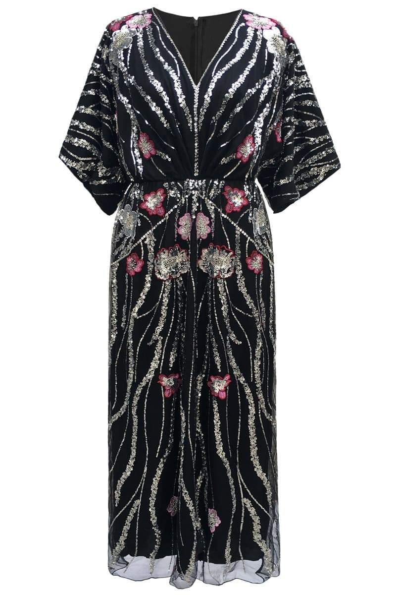 Nina Çiçek İşlemeli Payetler Maxi Elbise