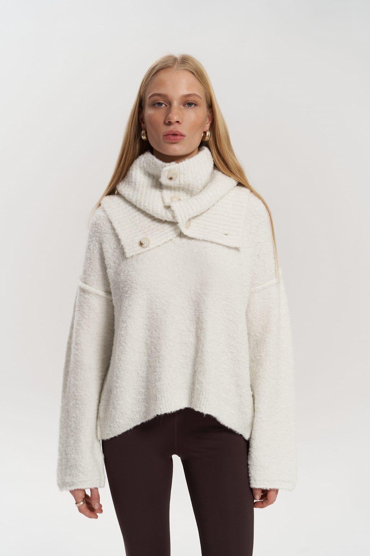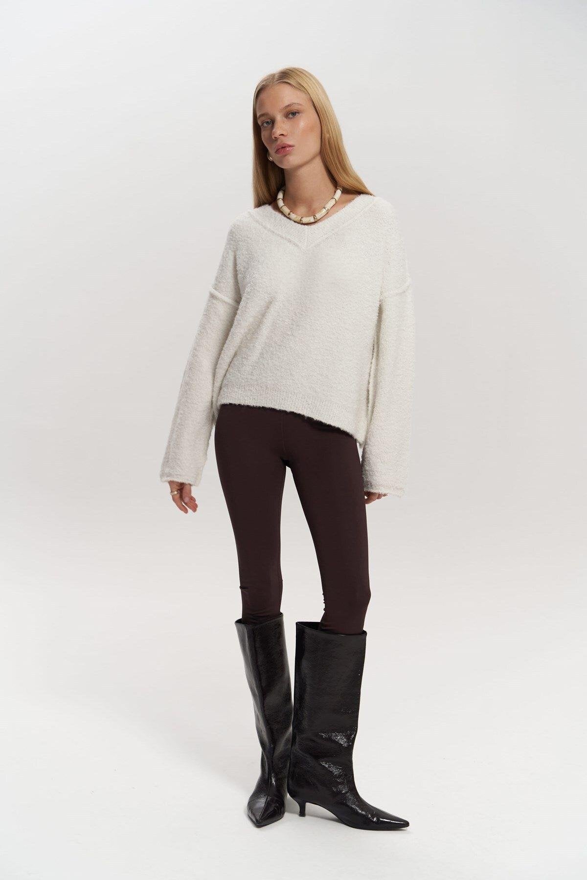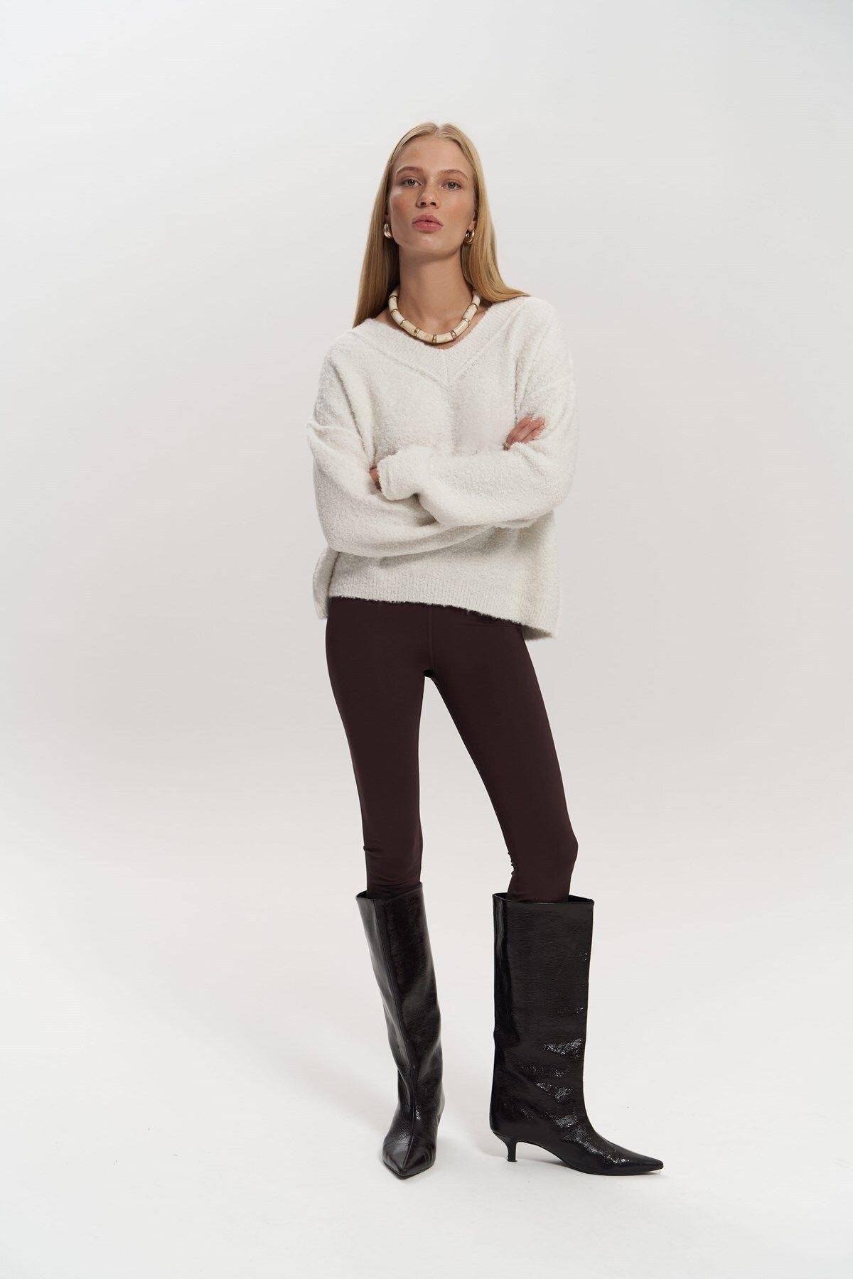 V yaka, yumuşak dokulu triko kazak. Eklenebilir düğme tasarımlı boyunluk aksesuarı ile birlikte.