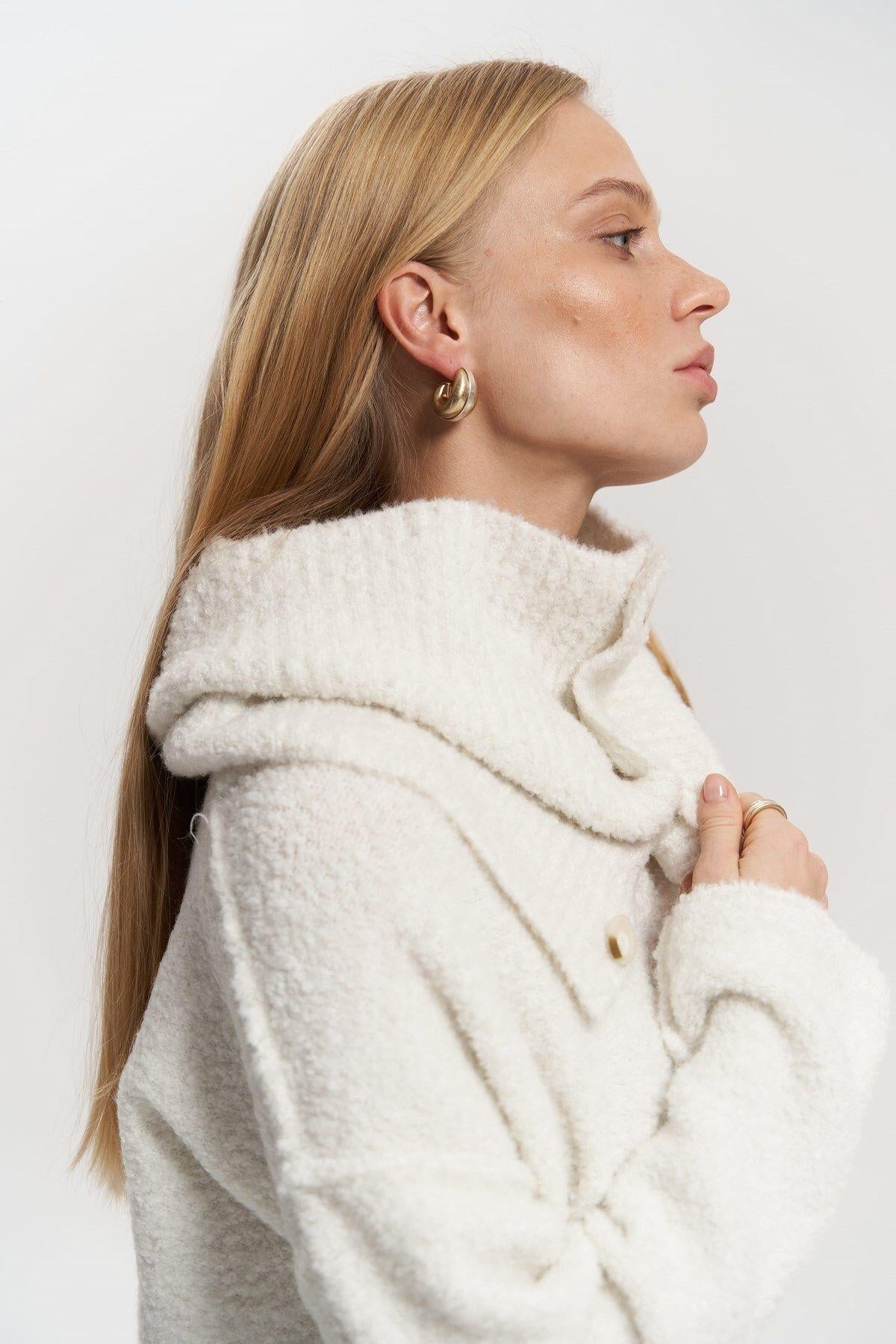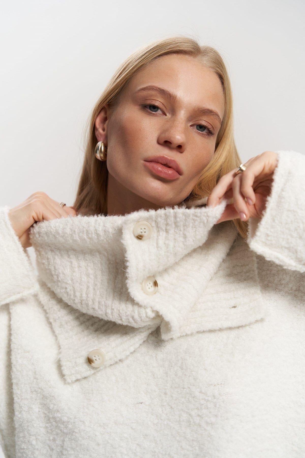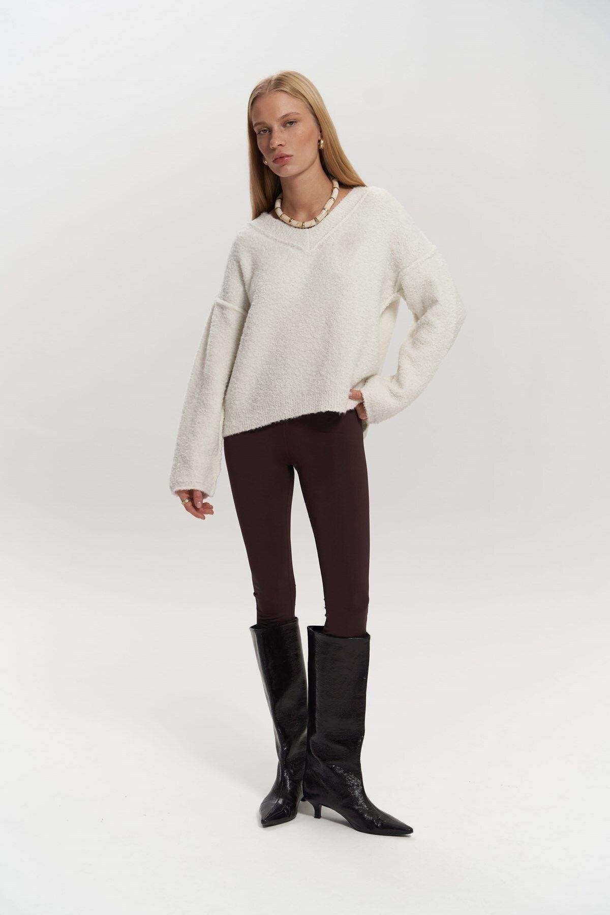 V yaka, yumuşak dokulu triko kazak. Eklenebilir düğme tasarımlı boyunluk aksesuarı ile birlikte.