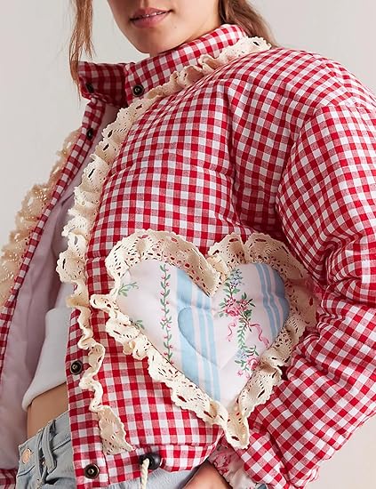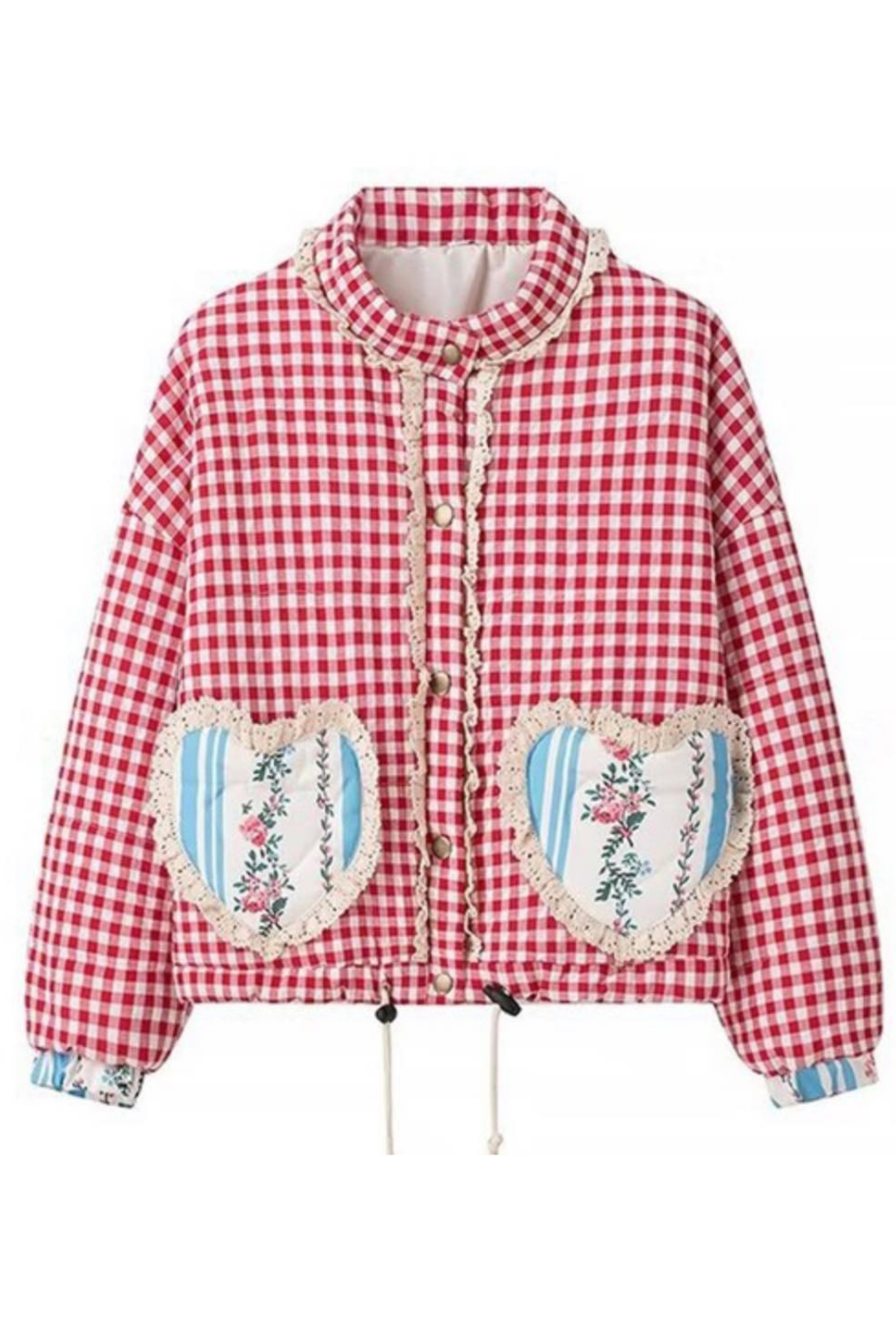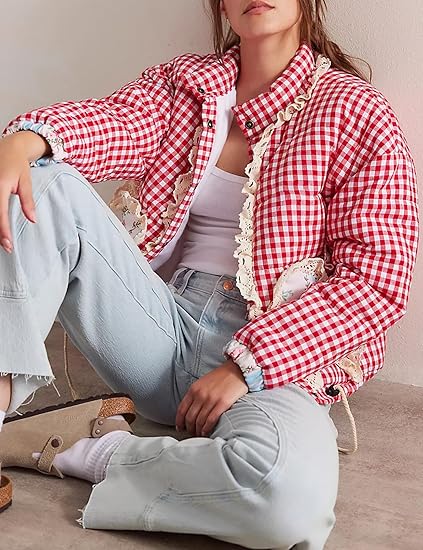 Retro esintili bu ceket, kırmızı-beyaz kareli deseniyle enerjik bir görünüm sunarken, ön kısmındaki kalp şeklinde aplikeli ceplerle romantik bir dokunuş katıyor. Çiçek desenli detaylar ve dantel kenar süslemeleri vintage ruhu modern bir şekilde yeniden yorumluyor. Günlük kombinlerde sevimli bir stil arayanlar için ideal.