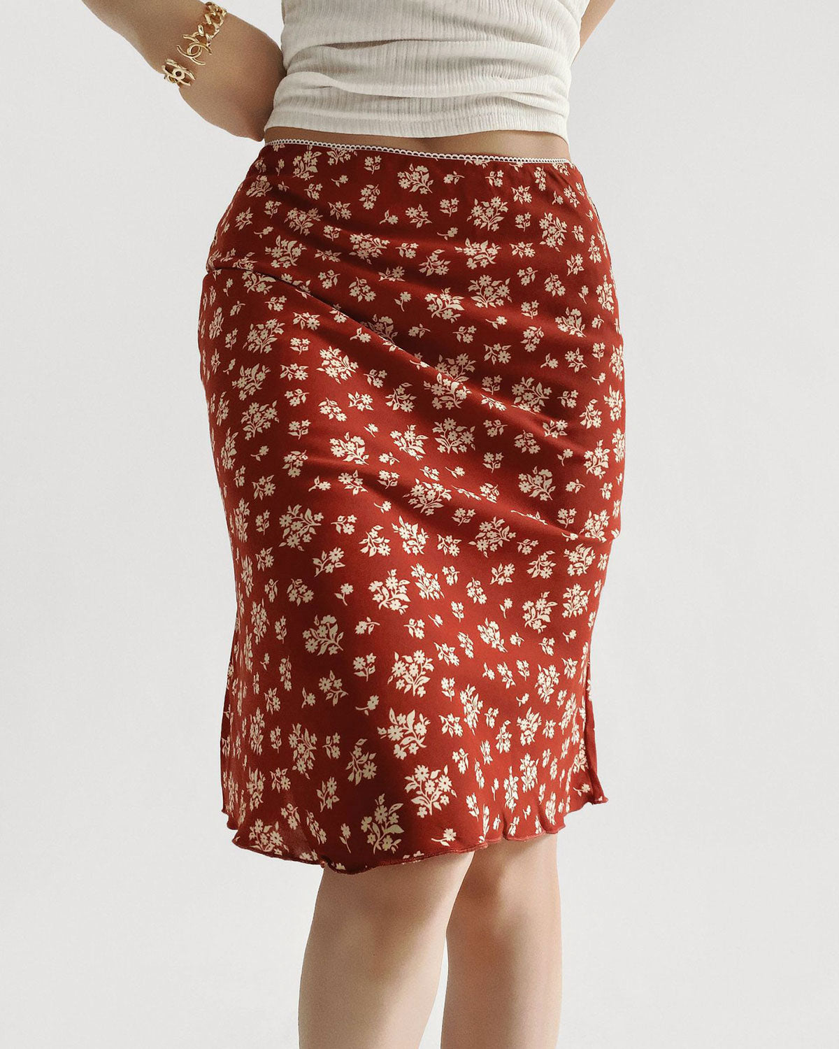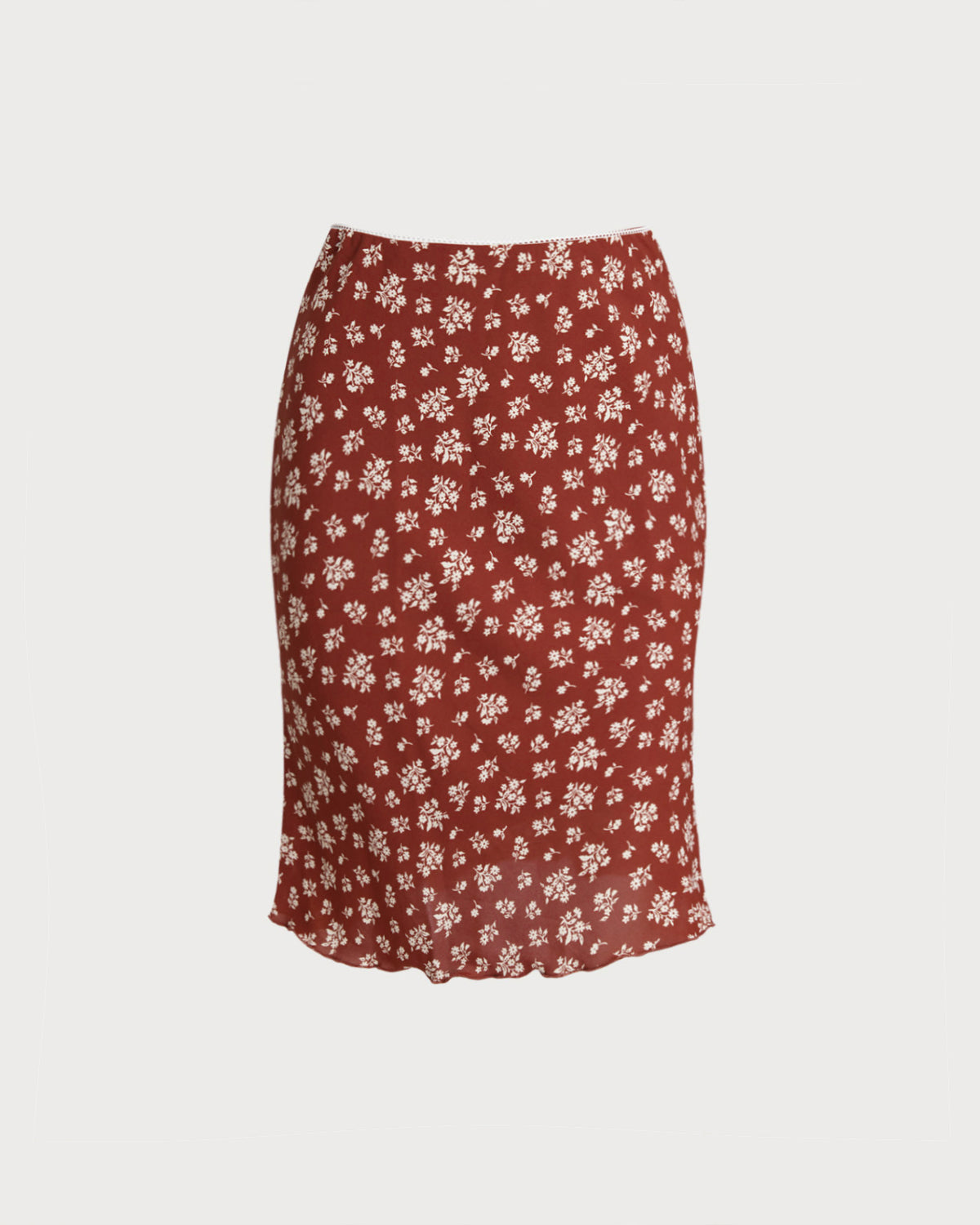 Kırmızı Çiçekli Düz Diz Boyu Etek