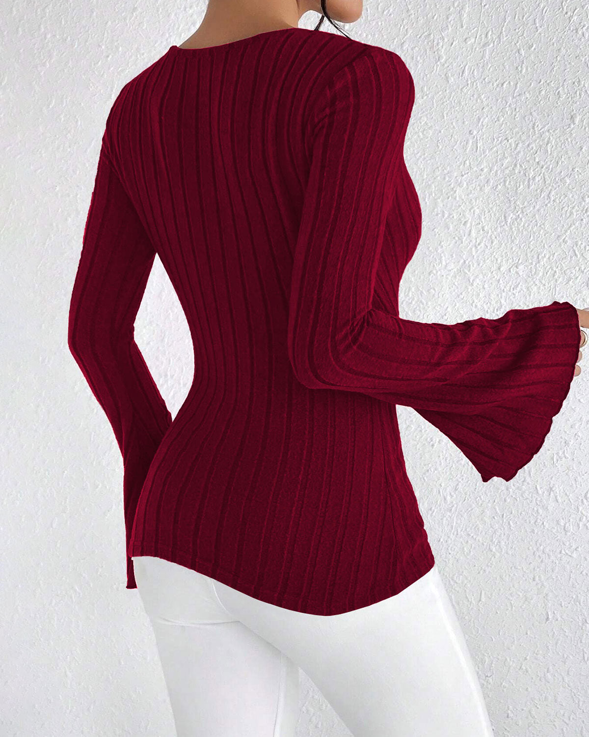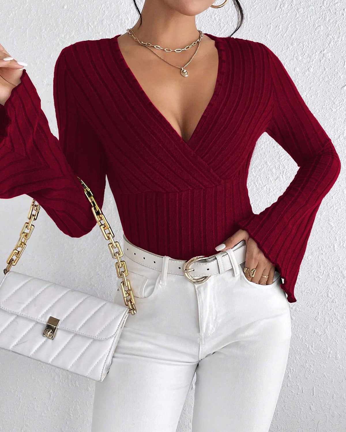 Kırmızı Örme V Yaka Çan Kollu Tişört