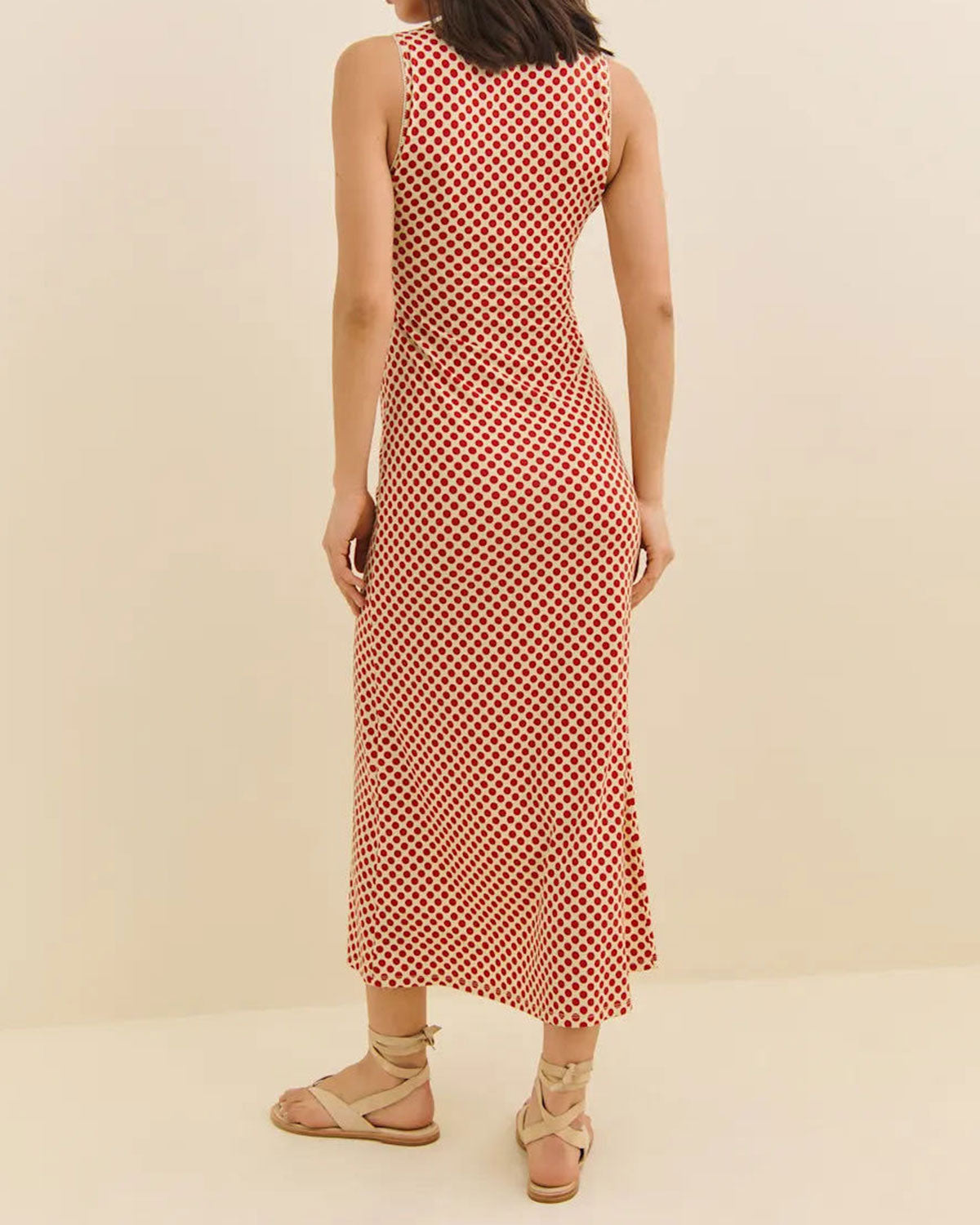 Kırmızı Puantiyeli Kolsuz Uzun Elbise