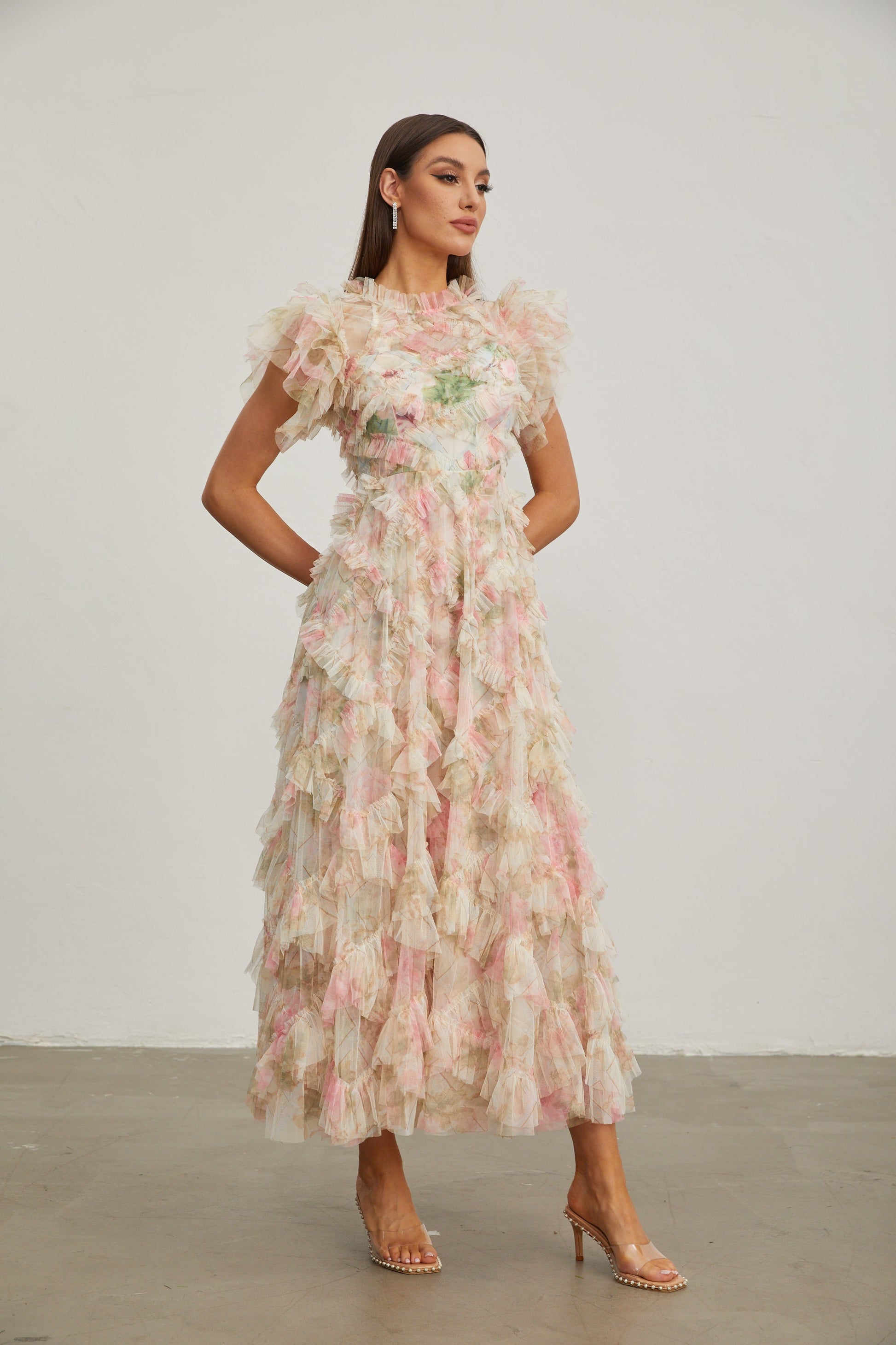 Yüksek Yakalı ve Midi Etekli Çiçek Desenli Dantel Elbise