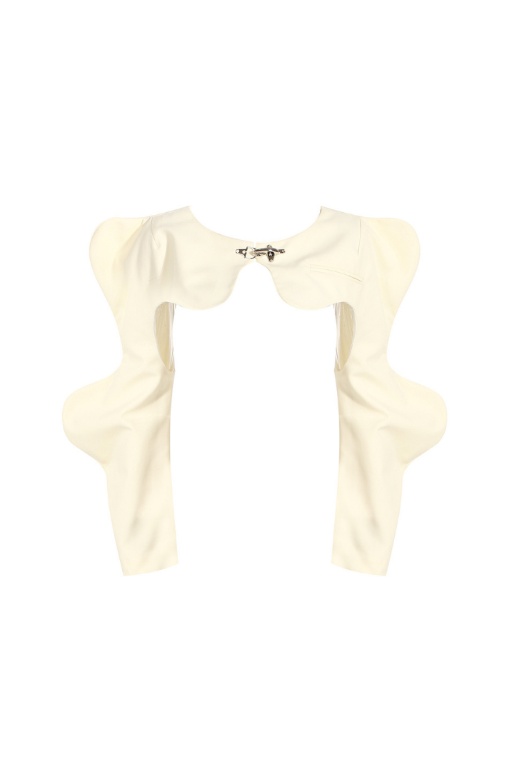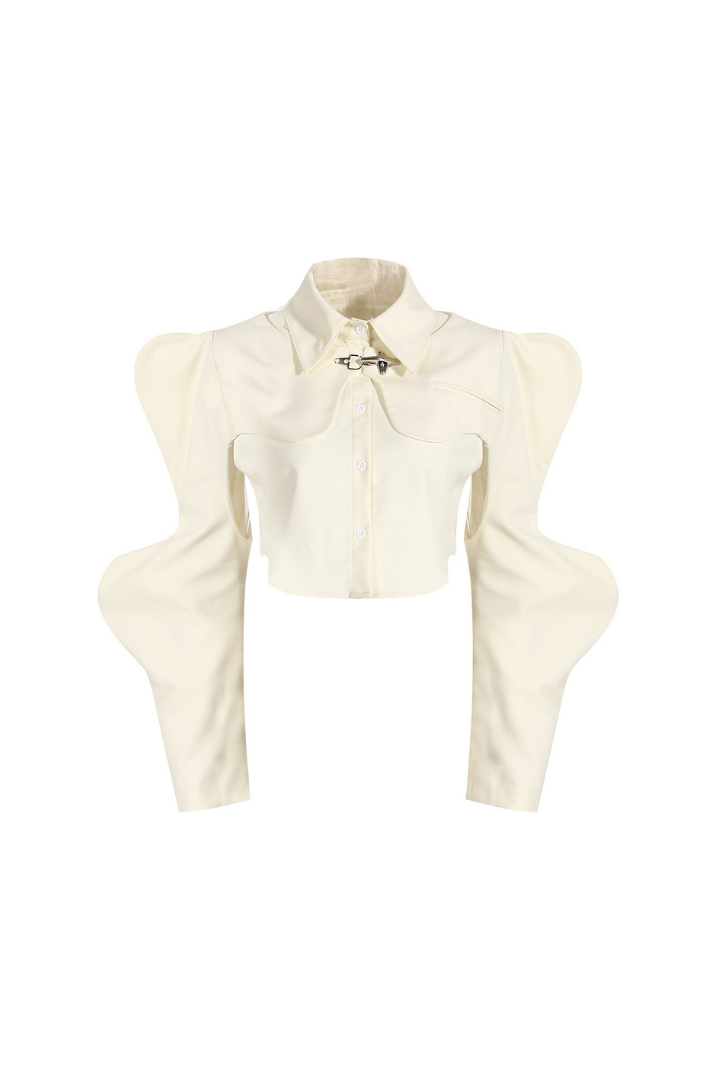 Cesur ve farklı tasarımları sevenler için hazırlanan bu crop gömlek, klasik kesimi avangart detaylarla yeniden yorumluyor. Omuzlardan aşağıya doğru inen heykelsi kollar ve üstte yer alan metal tokalı kapama, parçaya sofistike bir hava katıyor. Kısa kesimiyle modern bir siluet sunarken, gardırobunuza sanatsal bir dokunuş getiriyor.