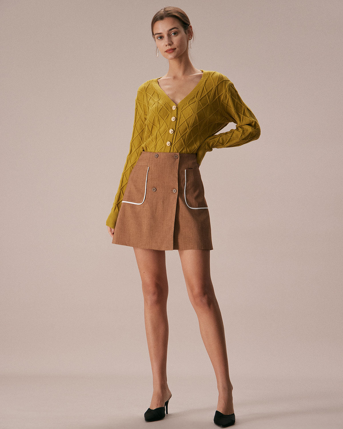 Haki Kontrast Kesim Düğmeli Mini Etek