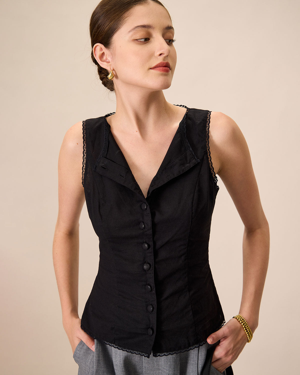 Kadın Siyah Tekne Yaka Pamuklu Keten Yelek