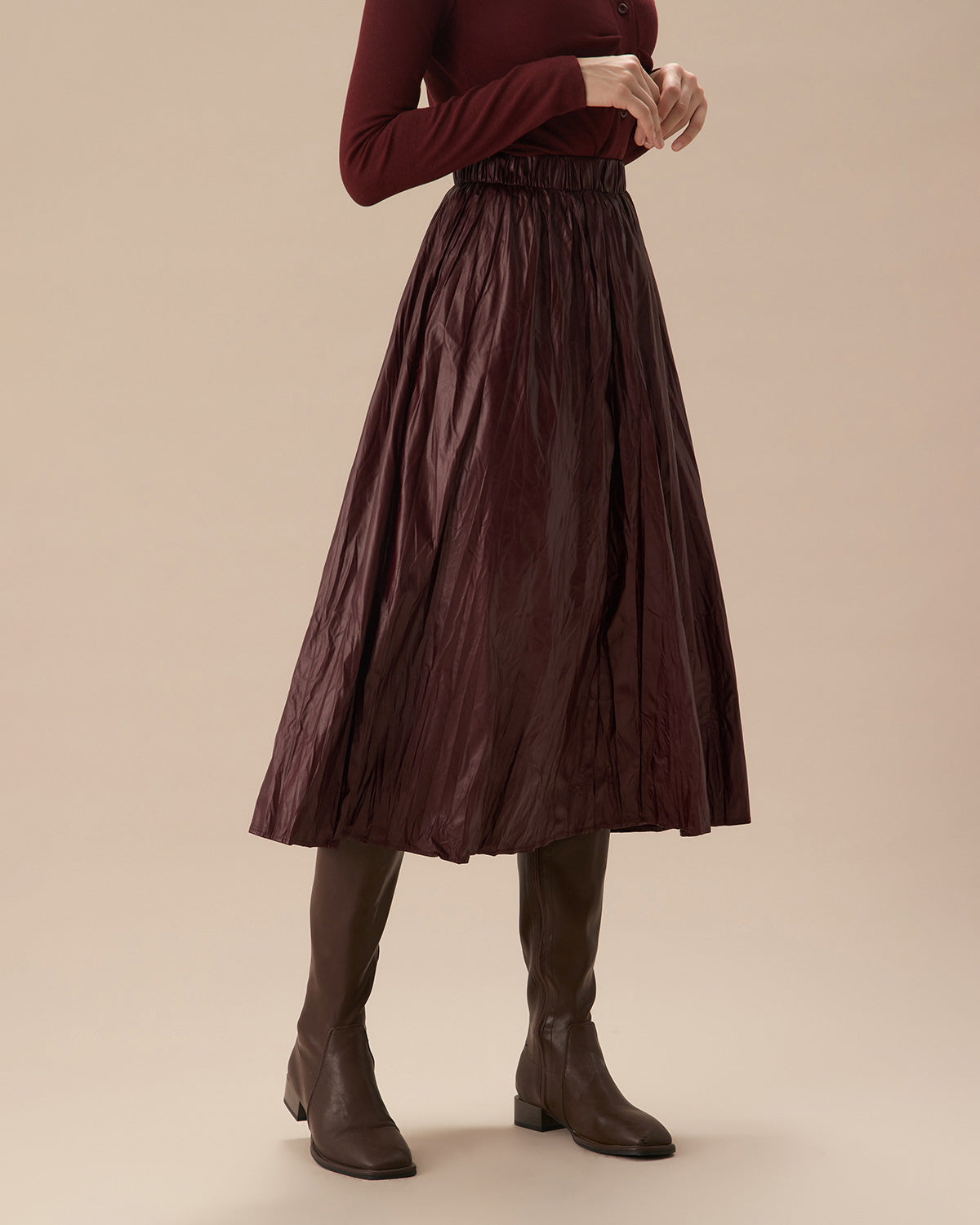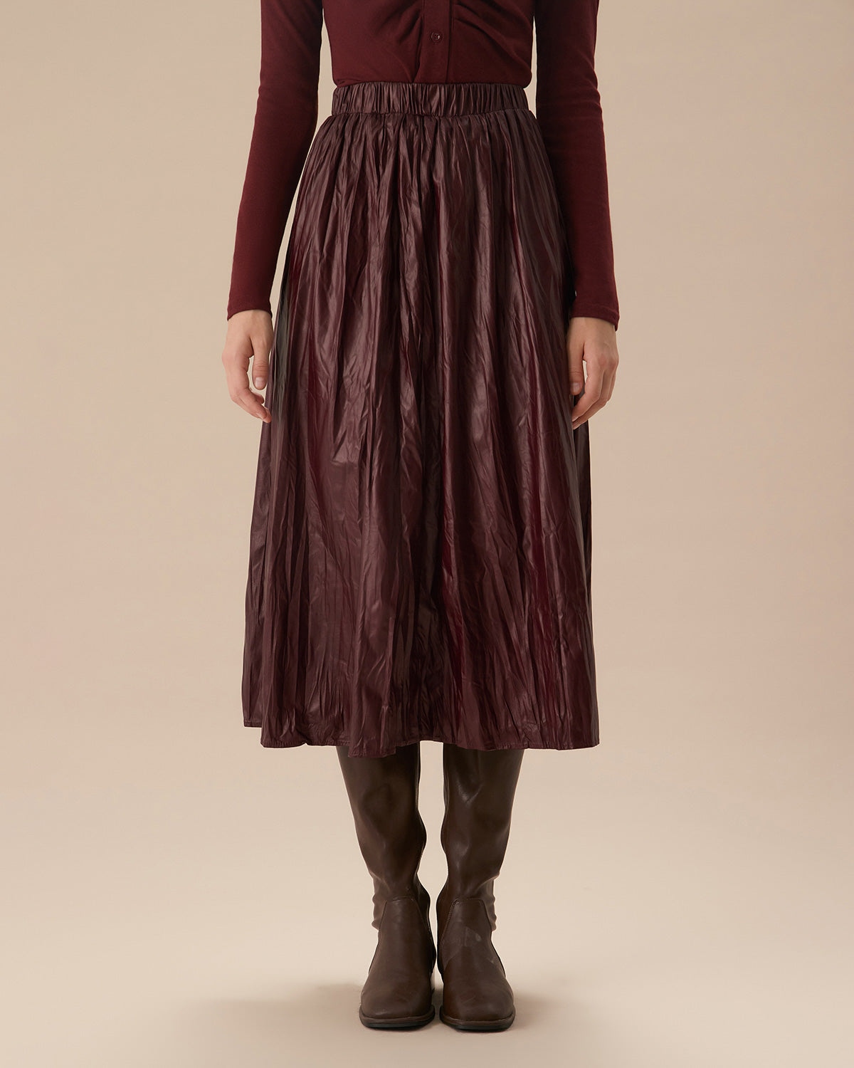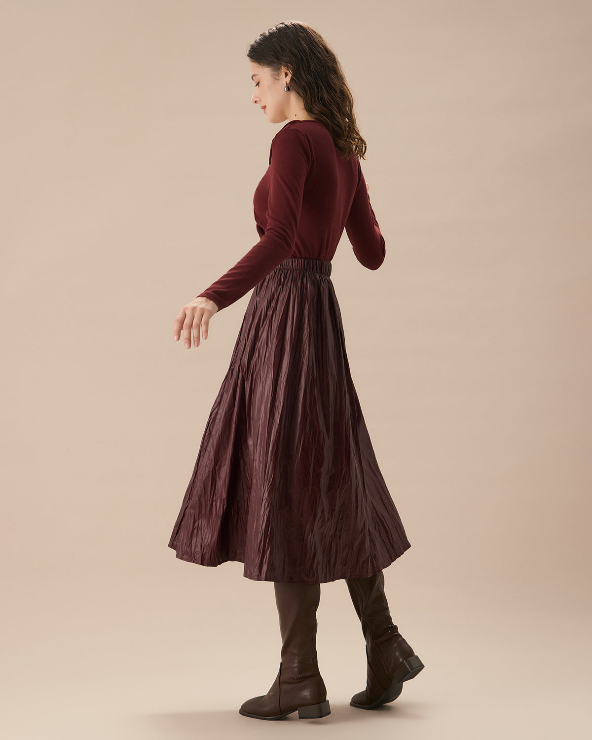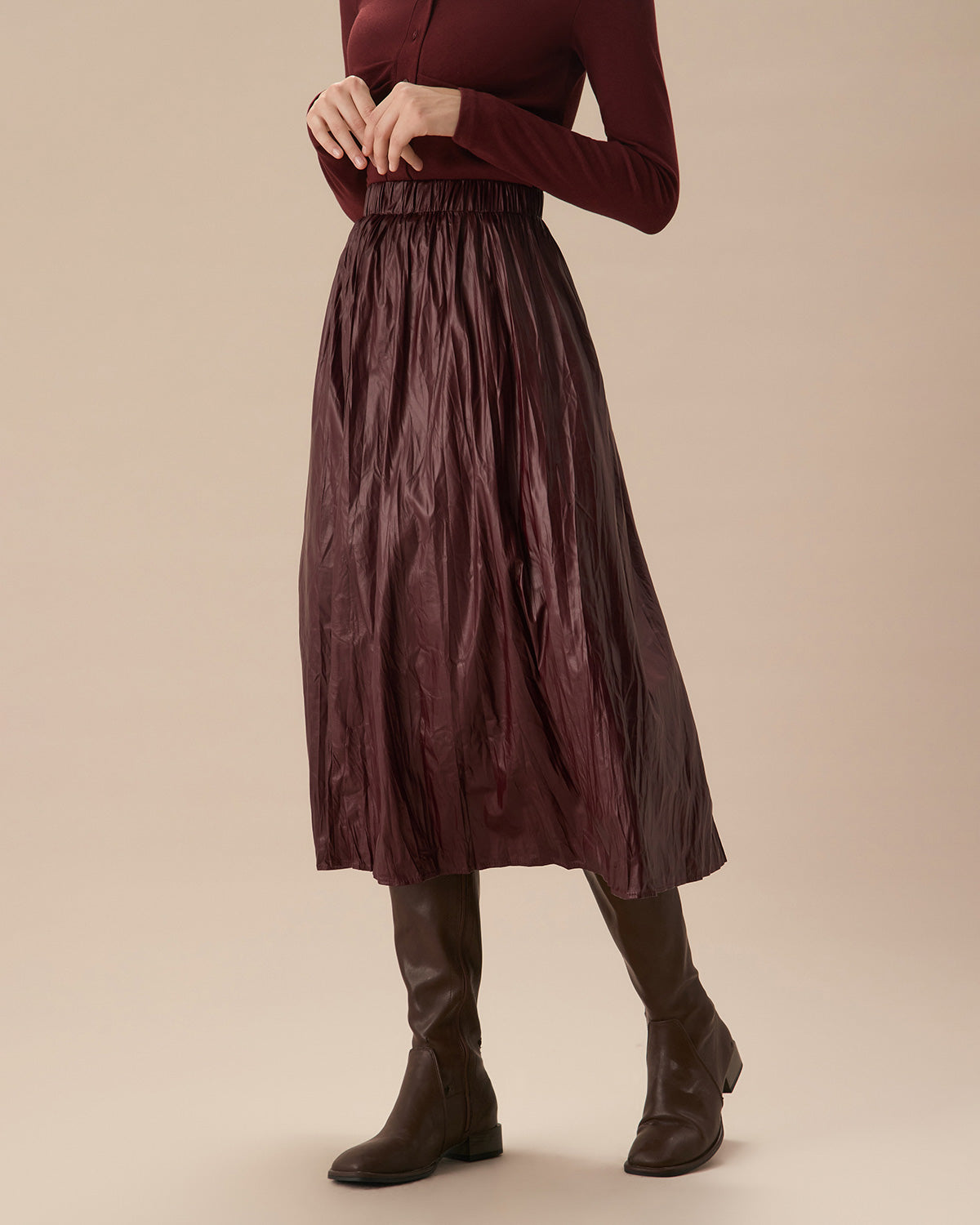 Esnek bir lastik bel bandı ve şık kırışık detayları ile bu midi etek, vücut hatlarını vurgulayan, feminen bir silüet oluşturur. Zengin şarap kırmızısı rengi cesur bir dokunuş ekleyerek, hem günlük hem de şık etkinlikler için mükemmel bir seçimdir.