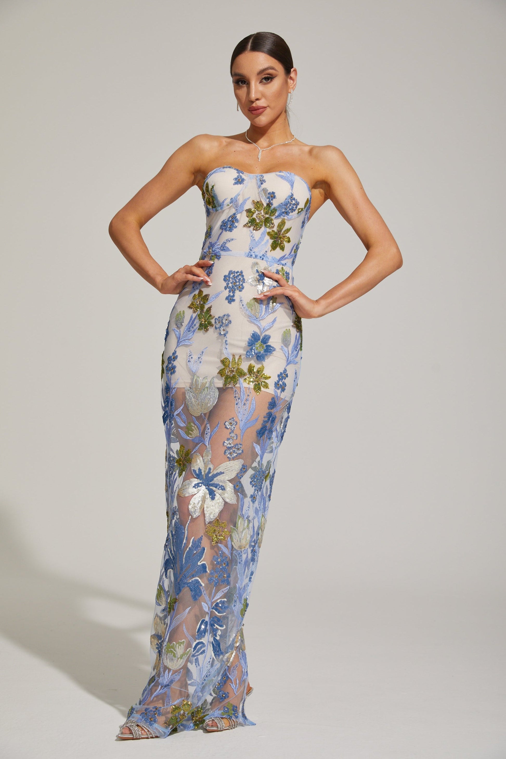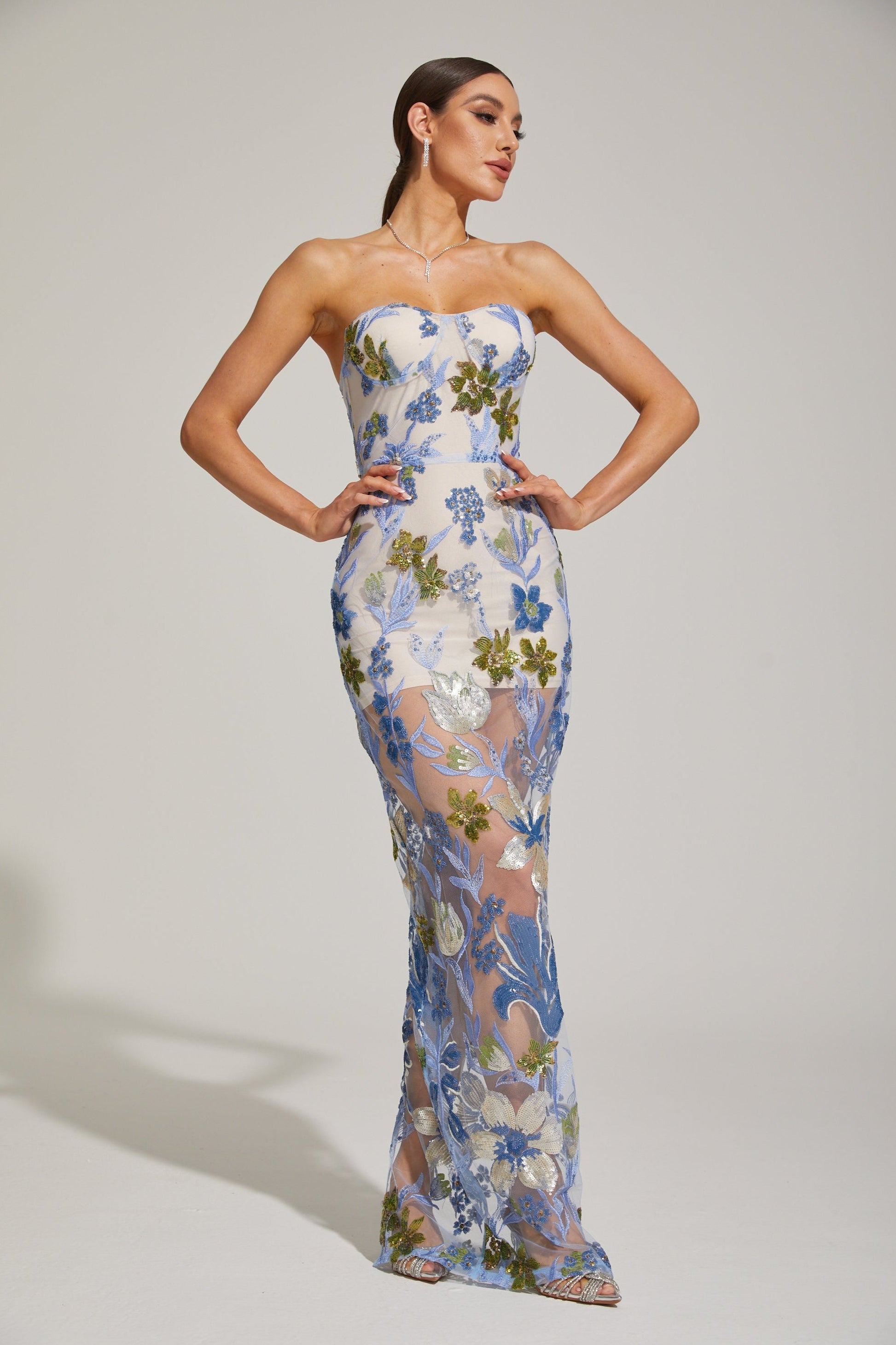 Xandrine Çiçek İşlemeli Straplez Uzun Elbise